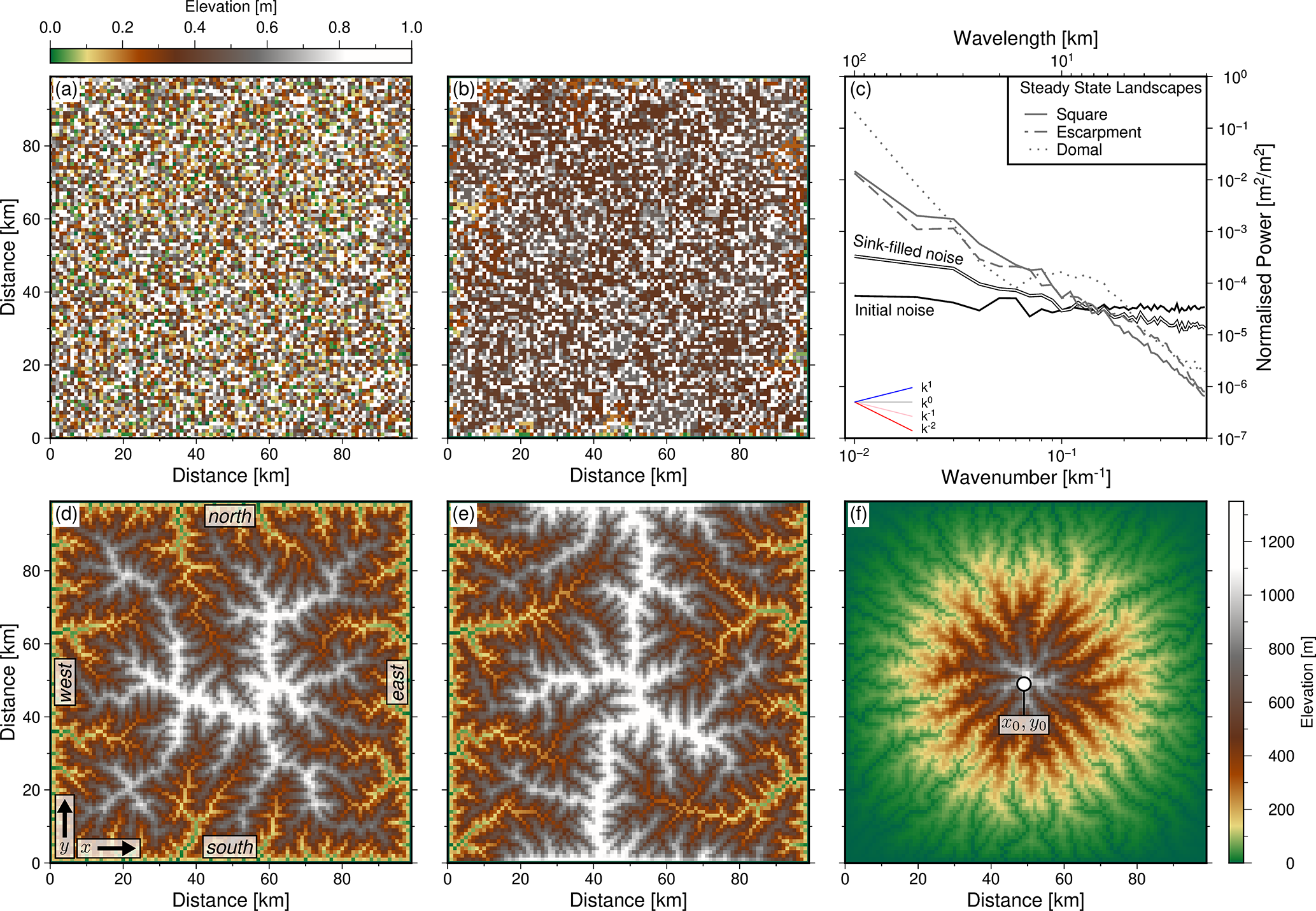 Each synthetic landscape in this study is generated by the following steps (Fig. 1). First, a uniform Cartesian (raster) grid with dimensions of 100 × 100 km and cell size of 1 × 1 km is generated. Elevations at the boundaries of the domain are fixed at zero (i.e., Dirichlet conditions). Each “east”, “west”, “south” or “north” boundary is individually set to be open/active (i.e., flux across it is permitted) or closed/inactive (i.e., flux is forbidden; see Hobley et al., 2017 for details). An initial (noisy) topography is then added to the grid. It is the choice of this initial topography, subsequent additive noise, and their consequences on resultant landscape evolution and associated metrics that are the foci of this paper. Topographic depressions are then filled to permit continuous flowlines and minimise the chance of internally draining regions forming (Barnes et al., 2014). Erosional parameters m=0.5 and kyr−1. Erosional “diffusivity” κ = 100 m2 kyr−1. Diffusion is calculated using the explicit finite-volume method within the Landlab model component LinearDiffuser