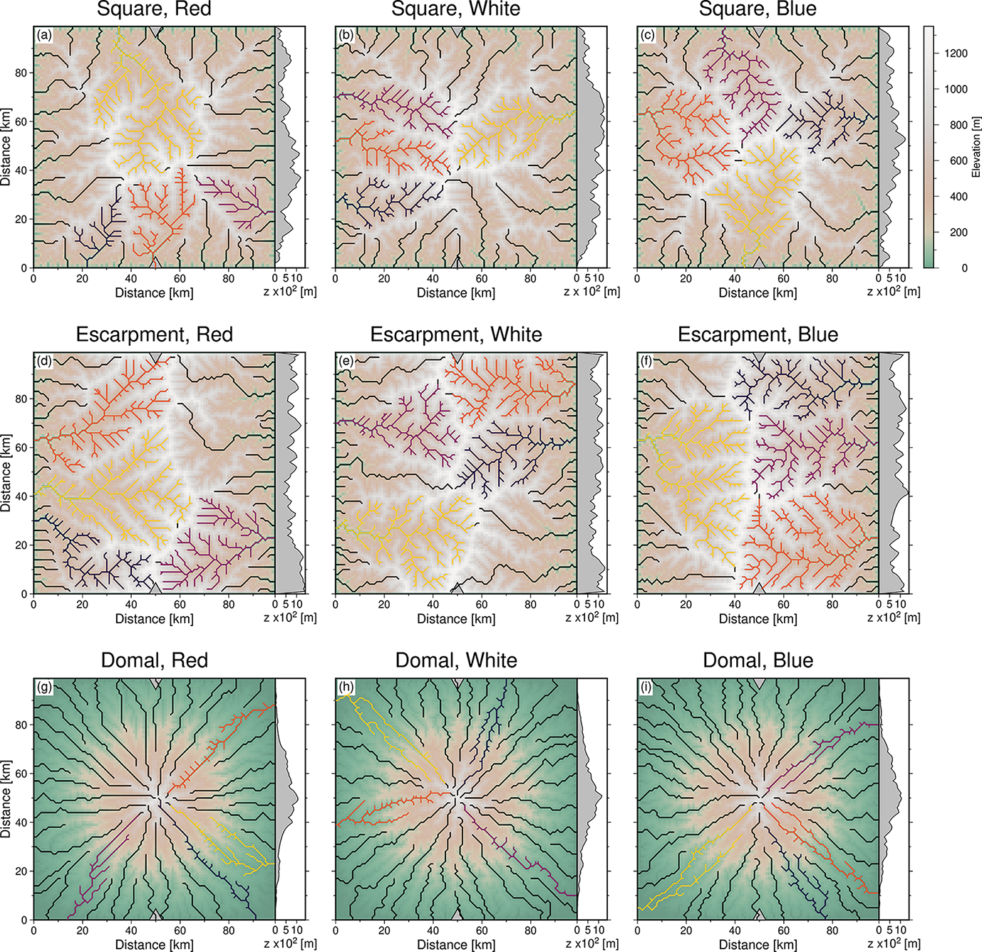 Figure 6Steady state landscapes generated with different initial conditions. (a–c) Steady state “square” landscapes generated with red, white and blue initial conditions, respectively. Planforms of channels in the four largest drainage networks in each landscape are emphasised by the coloured lines. Main (longest) channels of 40 largest basins shown in black lines, plus the four longest coloured lines. Adjacent topographic transects are between grey triangles at x=50 km. (d–f) As above, for “escarpment” landscapes. (g–i) As above, for “domal” landscapes.