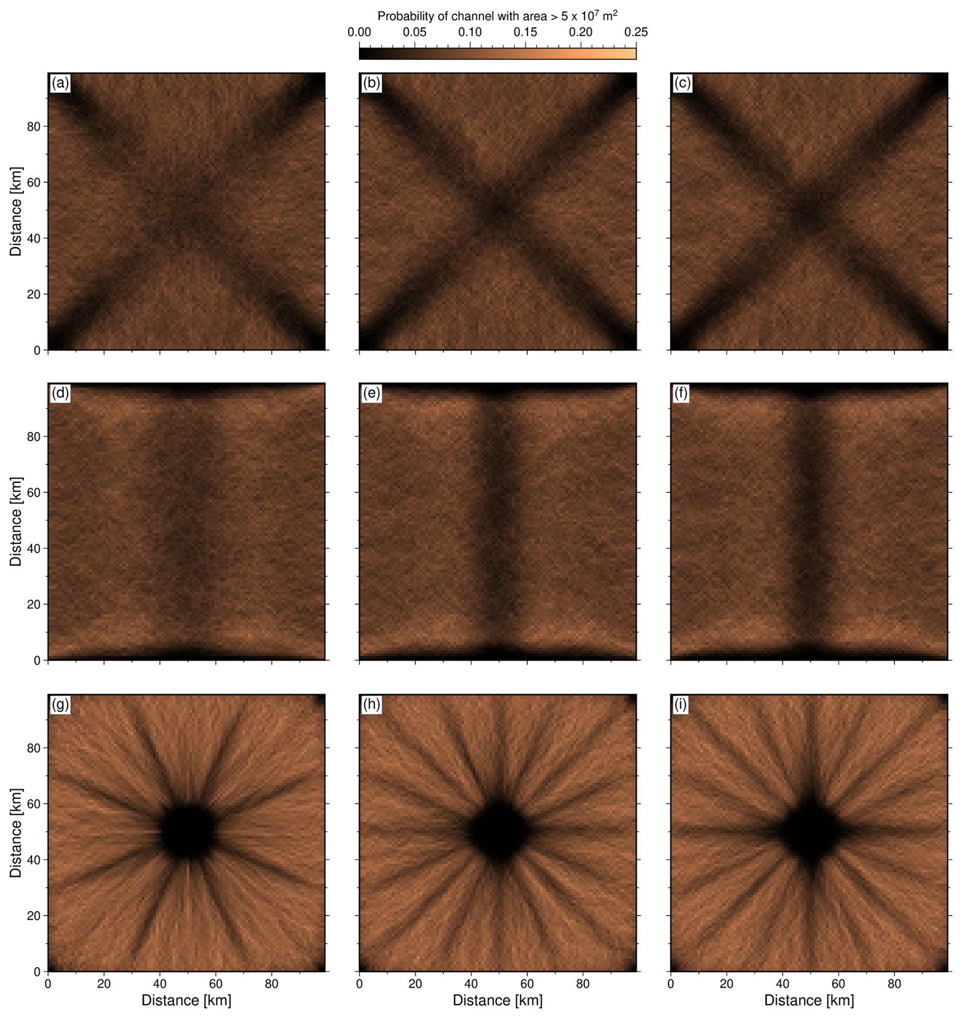 Figure 9Probability of drainage within landscapes generated by different arrangements of initial noise. (a–c) Colours indicate probability of a grid cell in 1000 “square” landscapes containing a channel with upstream drainage area > 5 × 107 m2 generated with initial red (a), white (b), or blue (c) noise. (d–f) As above, for “escarpment” landscapes, and (g–i) for “domal” landscapes. Examples of individual landscapes that feature in this suite are shown in Fig. 6. Associated power spectra are shown in Fig. 10.