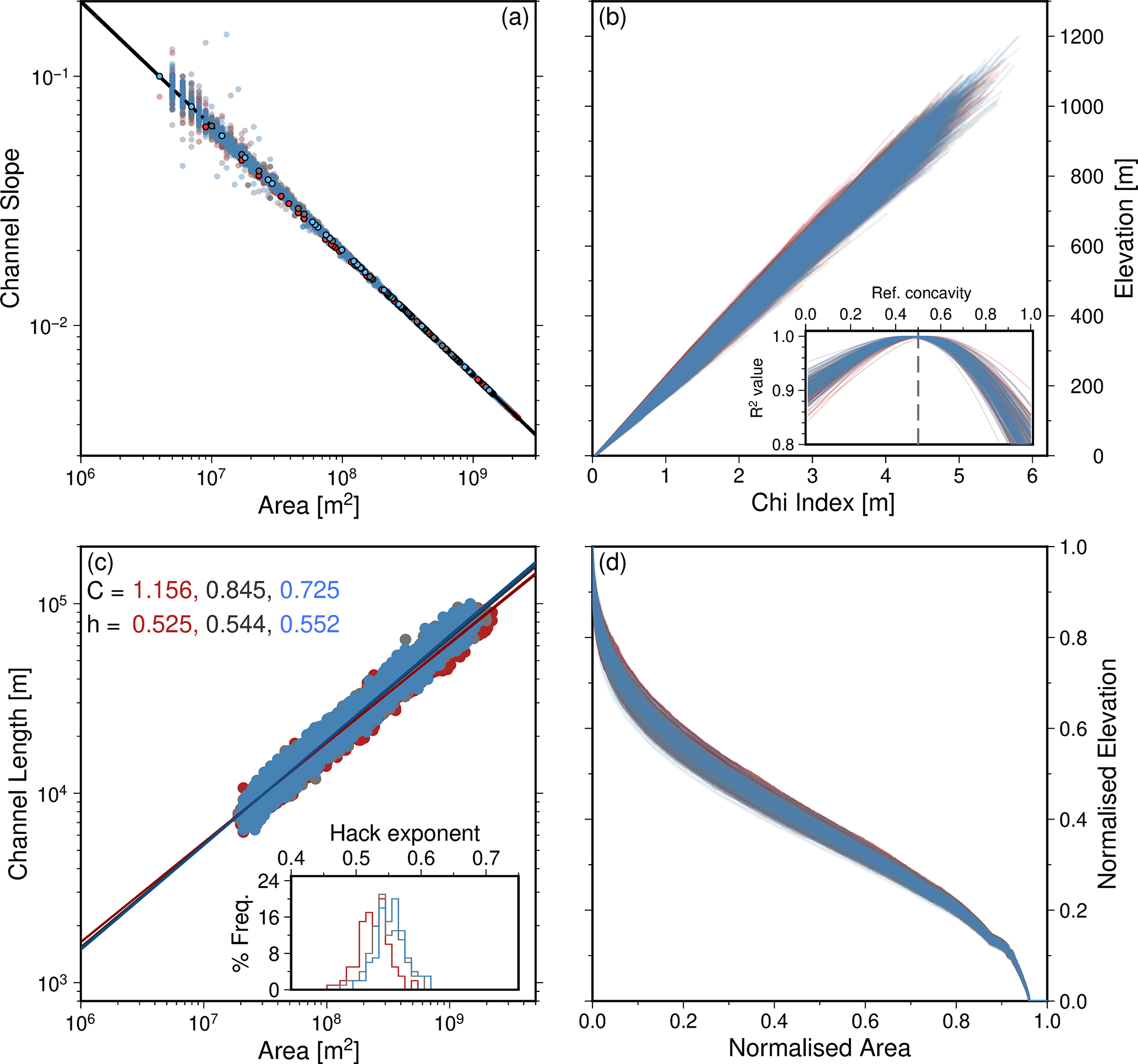 component of Landlab (modified for data manipulation and visualisation). We note that metrics are often derived, via slope-area or χ analyses, for instance, from profiles alone.