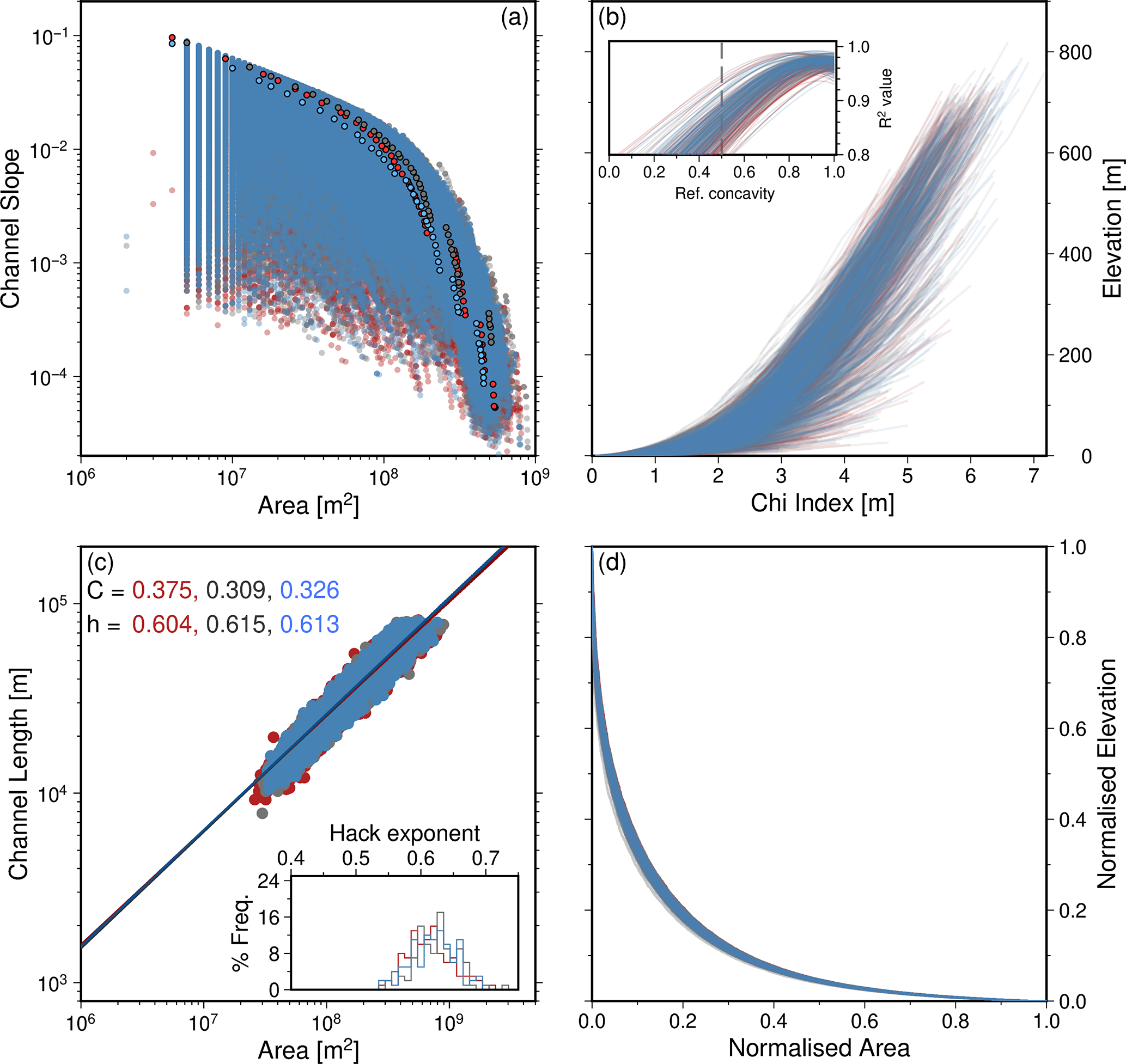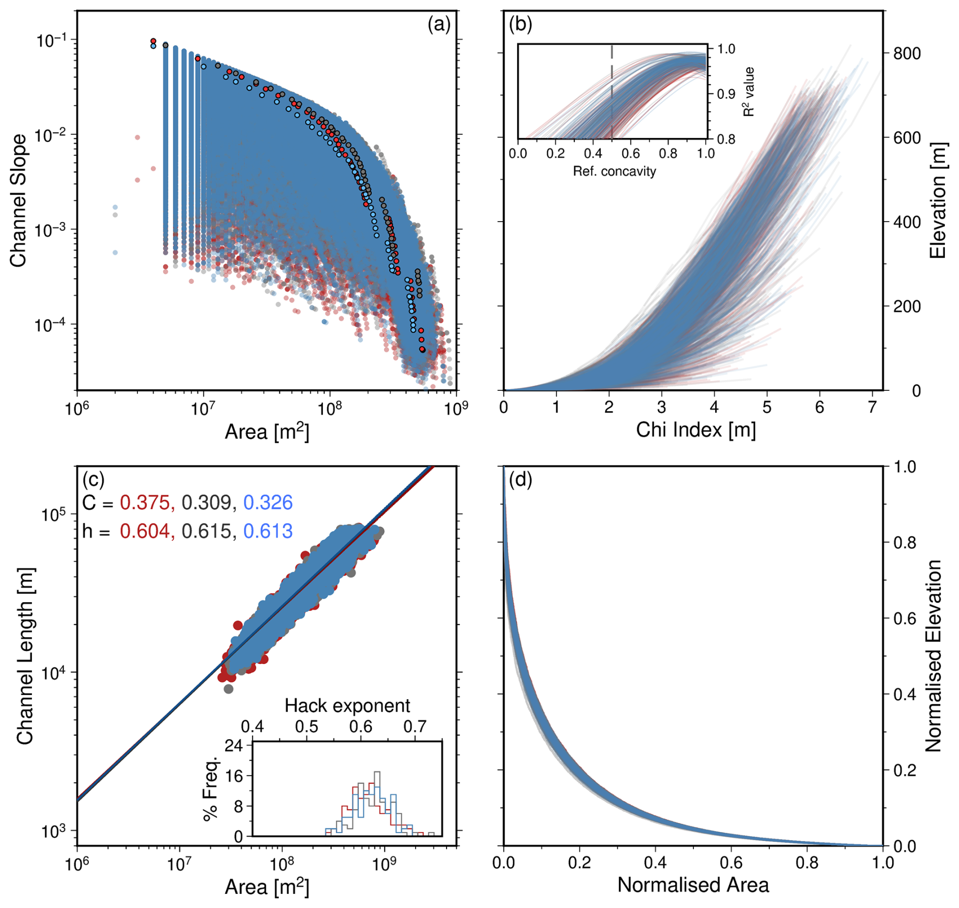 Hypsometry summarises area-elevation relationships of a landscape, including topography not necessarily incorporated into the other geomorphic metrics examined (see e.g., Langbein, 1947; Strahler, 1952, 1957; Harrison et al., 1983; Lifton and Chase, 1992; Willgoose and Hancock, 1998; Hurtrez et al., 1999; Montgomery et al., 2001). We calculate hypsometry for the entire domain of each steady state landscape by generating normalised cumulative density functions (the simple algorithm used is available; see the Code and Data Availability statement). Hypsometry is also produced for select landscapes during their evolution (e.g., Fig. 11g).