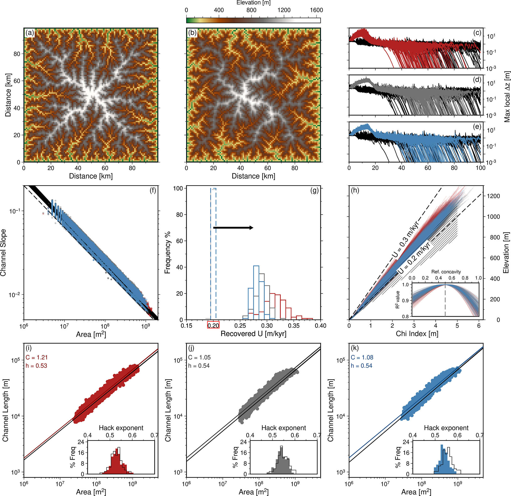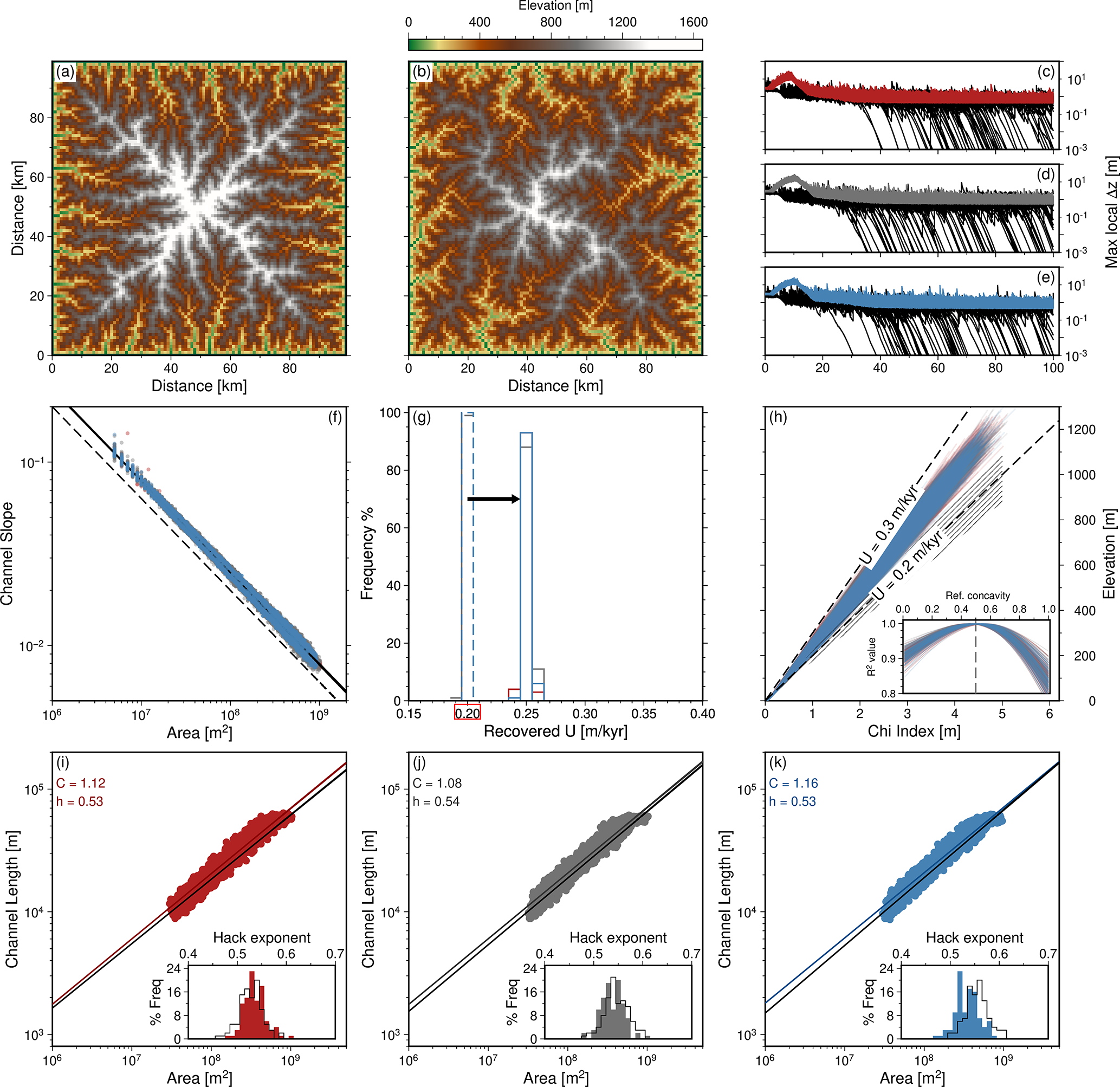 The black line in Fig. 11e shows the analytical relationship (from Eq. 14) between slope and area expected for all rivers within steady state landscapes generated with “block” uplift (see Fig. 4: “square”, “escarpment”) in this study given the values of erosional parameters and uplift rate used. We restrict slope-area analysis of river profiles extracted from the two-dimensional landscapes to cells with upstream drainage areas > 4 km2, a value often used in studies of real landscapes as indicative of overland flow (e.g., Whipple and Tucker, 1999; Roberts and White, 2010). Slope is calculated between adjacent cells in the streamwise distance downstream.