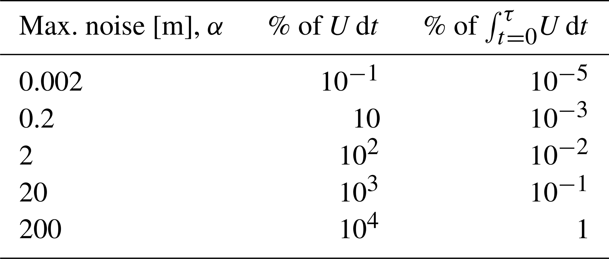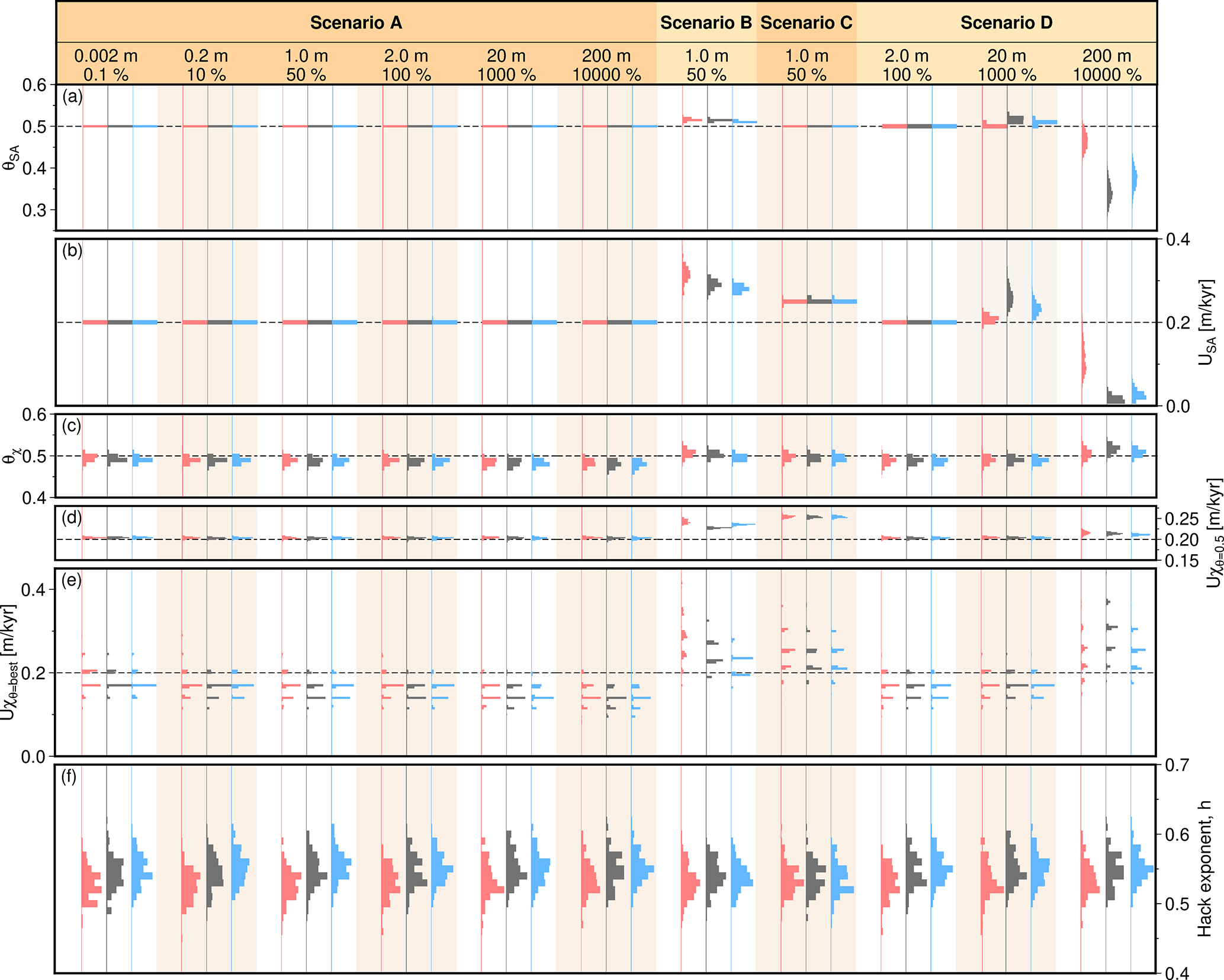 Scenarios A–C have flow routing and erosion applied in their final time step, after noise has been inserted. Thus, inserted noise is eroded for 10 kyr (i.e., the length of the time step) before metrics are extracted. In actuality, noise could be inserted into a landscape at any time. Thus, we test scenario D in which noise is inserted into synthetic landscapes at the end of model run time. We take the steady state landscapes (at 100 Myr) generated by scenario A with 1 m of noise and insert noise with the same arrangement. The impact of inserting final noise with scaled maximum amplitudes of 2, 20 and 200 m is assessed (see Table 1). For clarity, metrics are extracted from the noisy landscapes using drainage planforms determined before final noise is added, i.e., no additional flow routing or sink filling is performed. This approach is a generalisation, to two dimensions, of that presented in Roberts et al. (2012b) and Smith et al. (2022), in which noise is added directly to the longitudinal profiles of rivers (Fig. 4: ensembles 25–27).