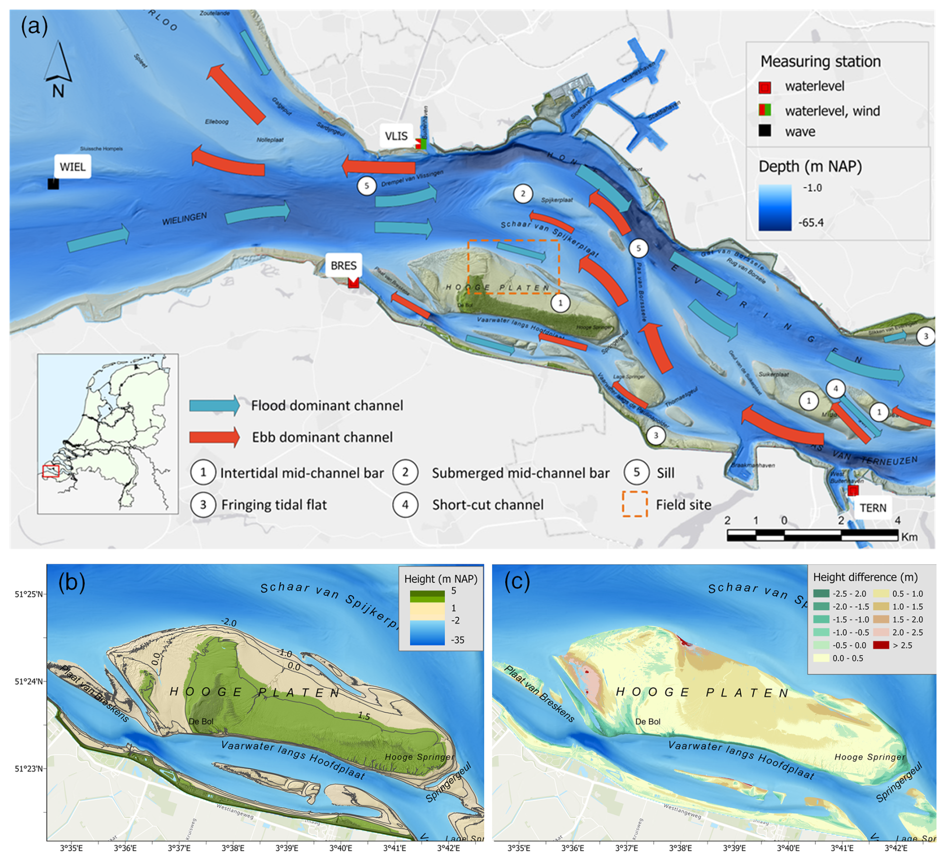 Figure 1(a) Overview of the western part of the Western Scheldt in the Netherlands. The ebb and flood patterns are derived from model calculations (ScalWest) with a representative spring tide as boundary condition and the bathymetry of the year in question. (b) Height of the mid-channel bar “Hooge Platen”. (c) Sedimentation/erosion between 2009–2019 in m. Height is relative to Dutch Ordnance Level (NAP).