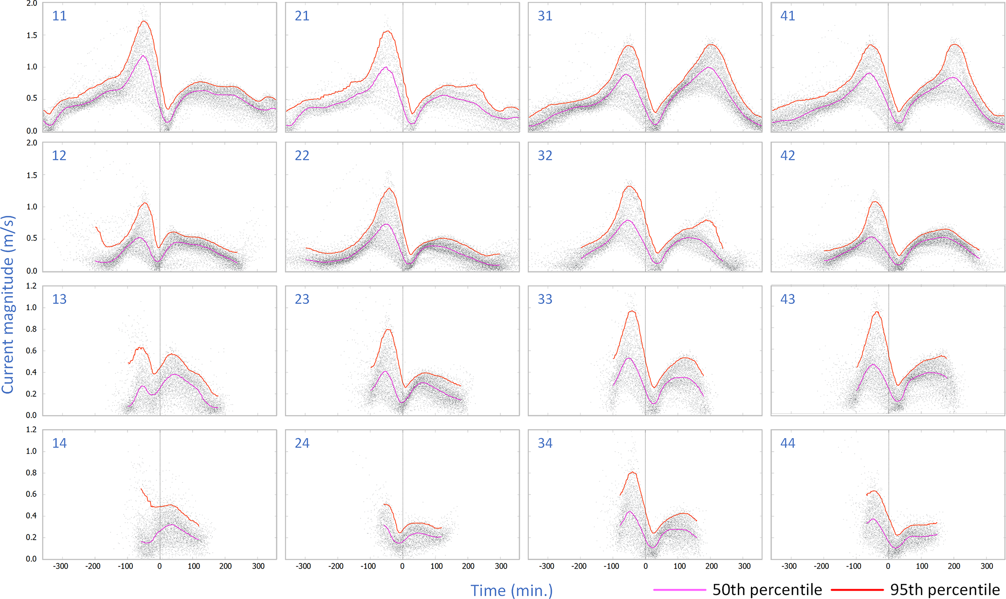 Figure 4Depth-averaged current magnitude relative to time of high water for each location with 50th percentile (magenta), and the 95th percentile (red). Time of high water is indicated with the dashed line.