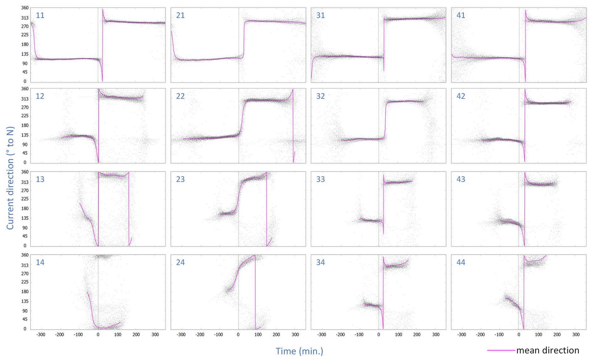 Figure 5Depth-averaged current direction relative to time of high water for each location with the circular mean (magenta). Time of high water is indicated with the dashed line.
