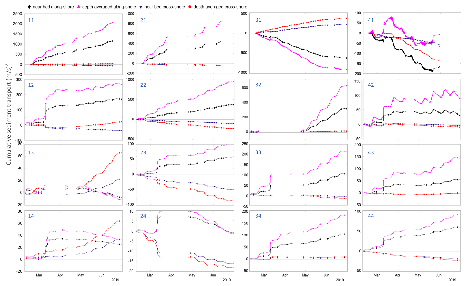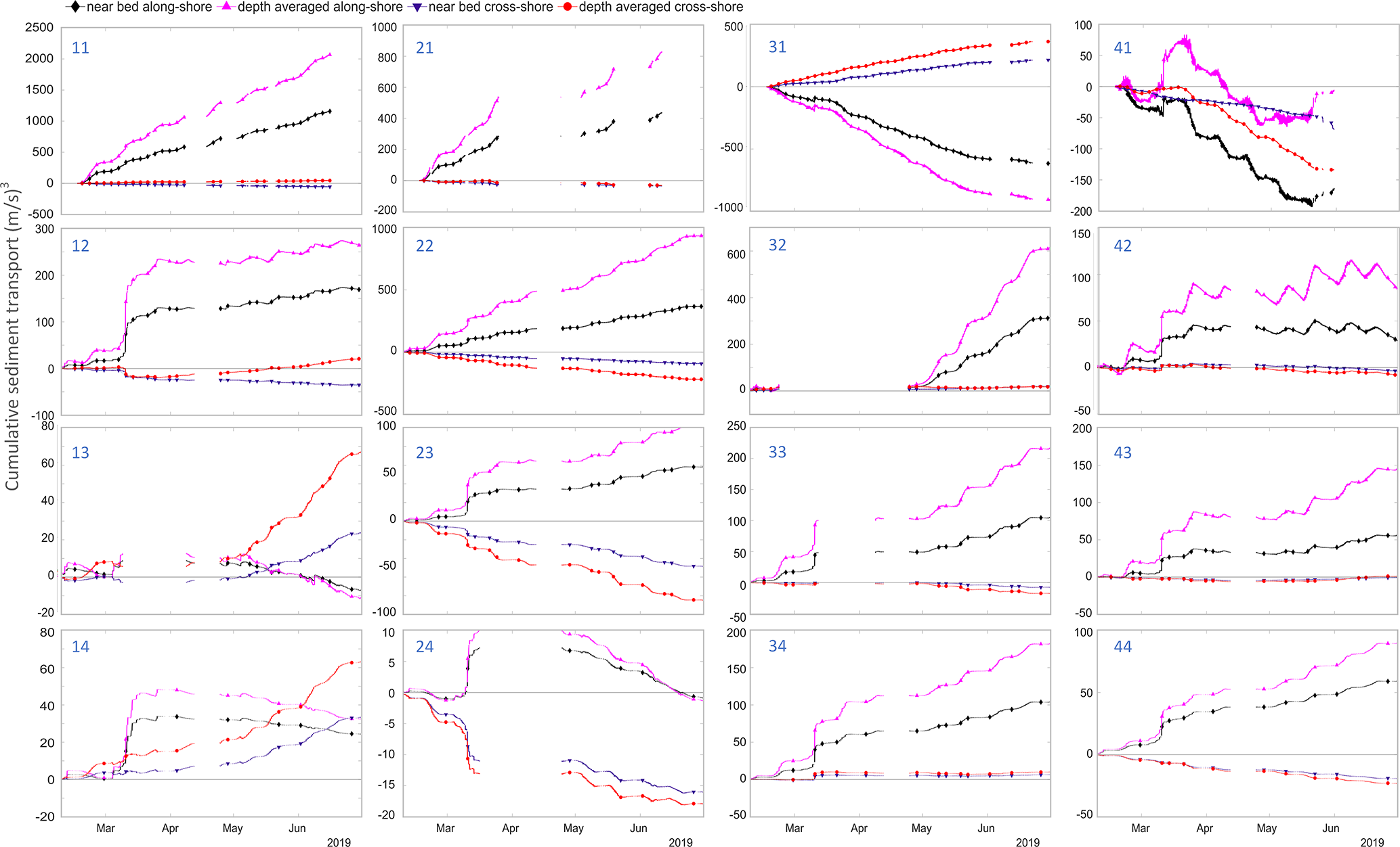 Figure 7Cumulative sediment transport, near-bed and depth-averaged, in along-shore direction (positive towards east) and cross-shore direction (positive towards north).