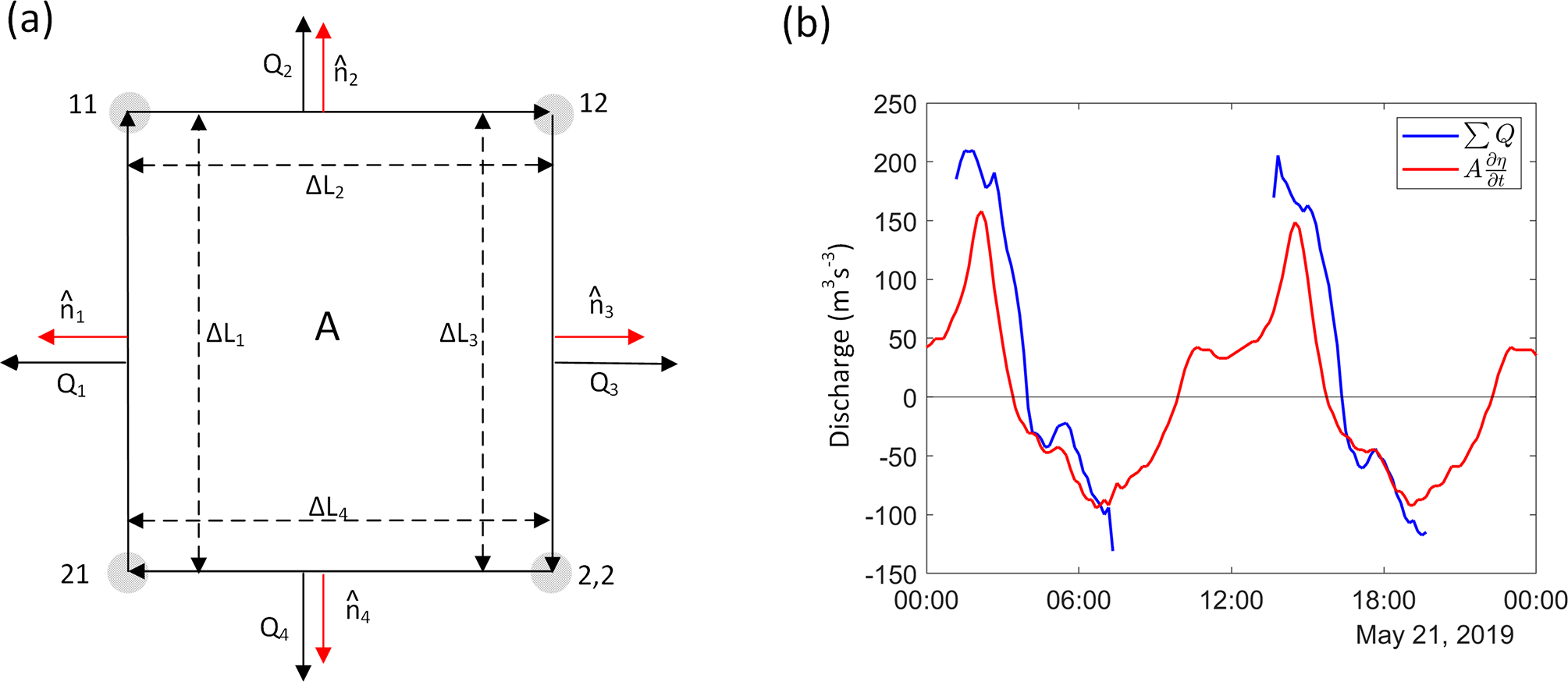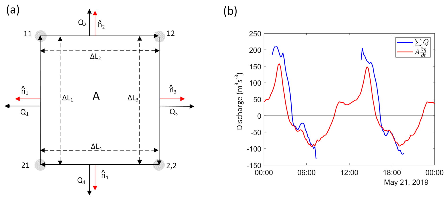 where A is the surface of the area. Note that the area in practice is not square since the measurement locations are not placed at an equal distance. Figure 10b shows the results for the area between the locations “22”, “32”, “23”, and “33”: the sum of the discharge calculated over the boundaries is in agreement with the discharge derived from the water level variation times the surface of the area.