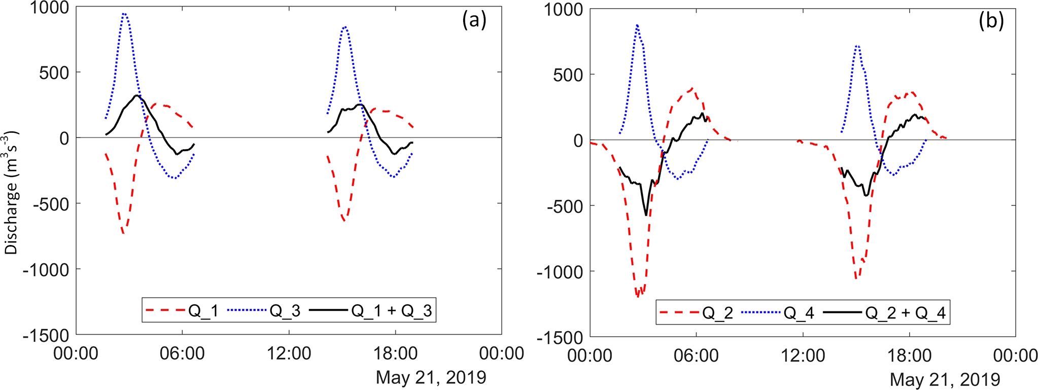 We analysed the along-shore and cross-shore discharge to understand their contribution to the total discharge of the area. Figure 11a and b show the times series. During flood the net flow in the along-shore direction is positive (eastern direction), as a result of which the area is emptied. In the cross-shore direction the net flow is negative (southern direction), filling the area. Since during flood the net influx must result in an incremental water level, the net cross-shore discharge must compensate for the loss in along-shore direction resulting in a large cross-shore discharge at the boundary “Q2”. During ebb the net flow in the along-shore direction is negative, i.e. the area is filled from the east, while the net flow in the cross-shore direction is positive (outflow to the north) and thus empties the area. Based on the flux quantities we conclude that part of the along-shore discharge at “Q3” is added to the cross-shore discharge at “Q2”. The net discharge created by the along-shore flow is compensated by the cross-shore discharge resulting in an increase of the cross-shore velocity. This explains the larger cross-shore flow velocities measured during flood and ebb than those based on the 1D approach presented earlier where the along-shore flow did not contribute to the discharge.
