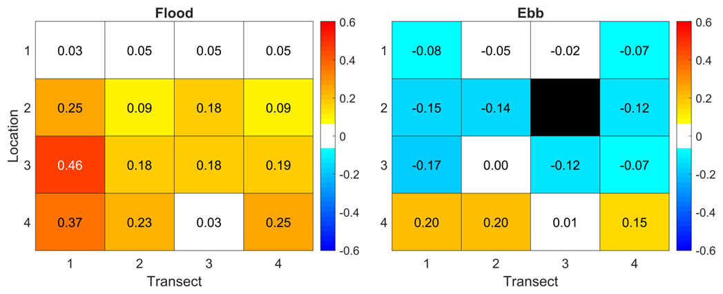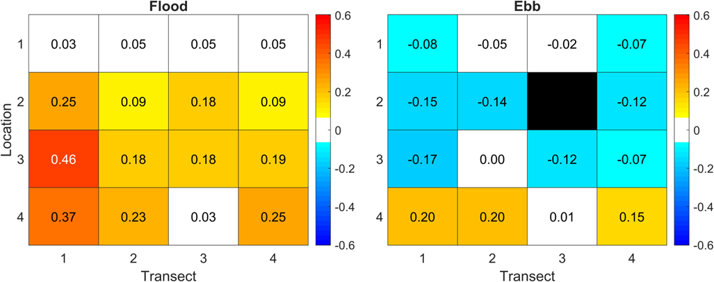 The results of the proxy for sediment transport showed that the cumulative transport at locations “11”, “21”, and “31” is a steady process, while at location “41” and at the mid-channel bar it has a more episodic character. For the locations on the mid-channel bar a probable cause may be the stronger influence of wind on the shallower parts of the tidal flat (Hir et al., 2000; de Vet et al., 2018; Colosimo et al., 2020). To quantify the effect of wind on the peak velocities we compared the peak current velocities during situations with almost no wind (wind speed less than 3 Beaufort) with those occurring during periods with high wind speed (more than 6 Beaufort). To do so, we proceeded with the following steps. First, we divided the peak velocity data into two subsets: a weak-wind selection containing peak velocities during wind speeds smaller than 3.3 ms−1 (3 Beaufort), and strong-wind selection containing peak velocities with wind speeds larger than 10.8 ms−1 (6 Beaufort). For both datasets the tidal range associated with the peak velocity was also registered. Second, for each measurement location a linear fit was made between the tidal range (X) and the peak velocities for ebb as well as flood (Y). Third, the obtained regression coefficients were used to calculate the peak velocities for strong wind given the tidal range in the dataset. Finally, to determine the effect of higher wind speed, the fraction between measured and calculated peak velocities was calculated. These are shown for flood and ebb on a logarithmic scale in Fig. 12. We see the most pronounced effect on the current flow at the shallowest parts of the tidal flats, especially during flood. This strong increase of flow velocities throughout flood high up the tidal flat also explains the more episodic character of the proxy for sediment transport at the highest parts of the tidal flat. During ebb when wind and tide are in the opposite direction, there is a reduction of the peak flow, although at the most shallow locations the current flow is amplified, despite the ebb current. The mean tidal range for both periods is almost the same: 3.72 m for weak wind and 3.68 m for strong wind. Therefore, changes in the peak velocities will be mainly caused by the wind stress.