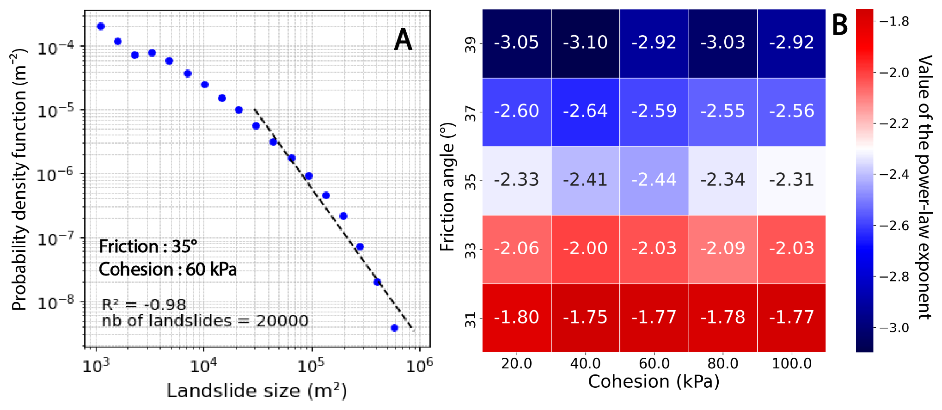 Jeandet, L., Steer, P., Lague, D., and Davy, P.: Coulomb Mechanics and Relief Constraints Explain Landslide Size Distribution, Geophysical Research Letters, 46, 4258–4266, https://doi.org/10.1029/2019GL082351, 2019.