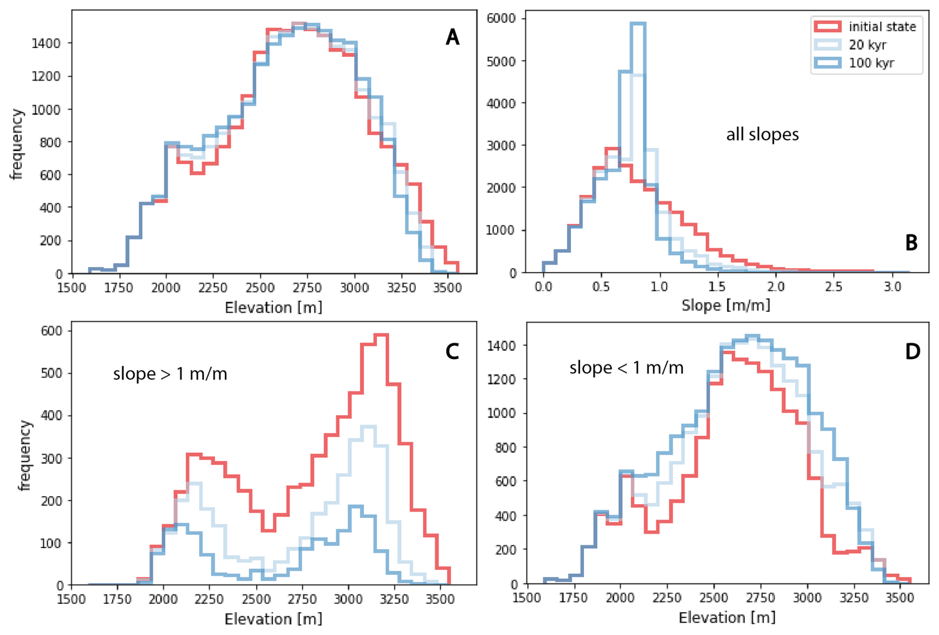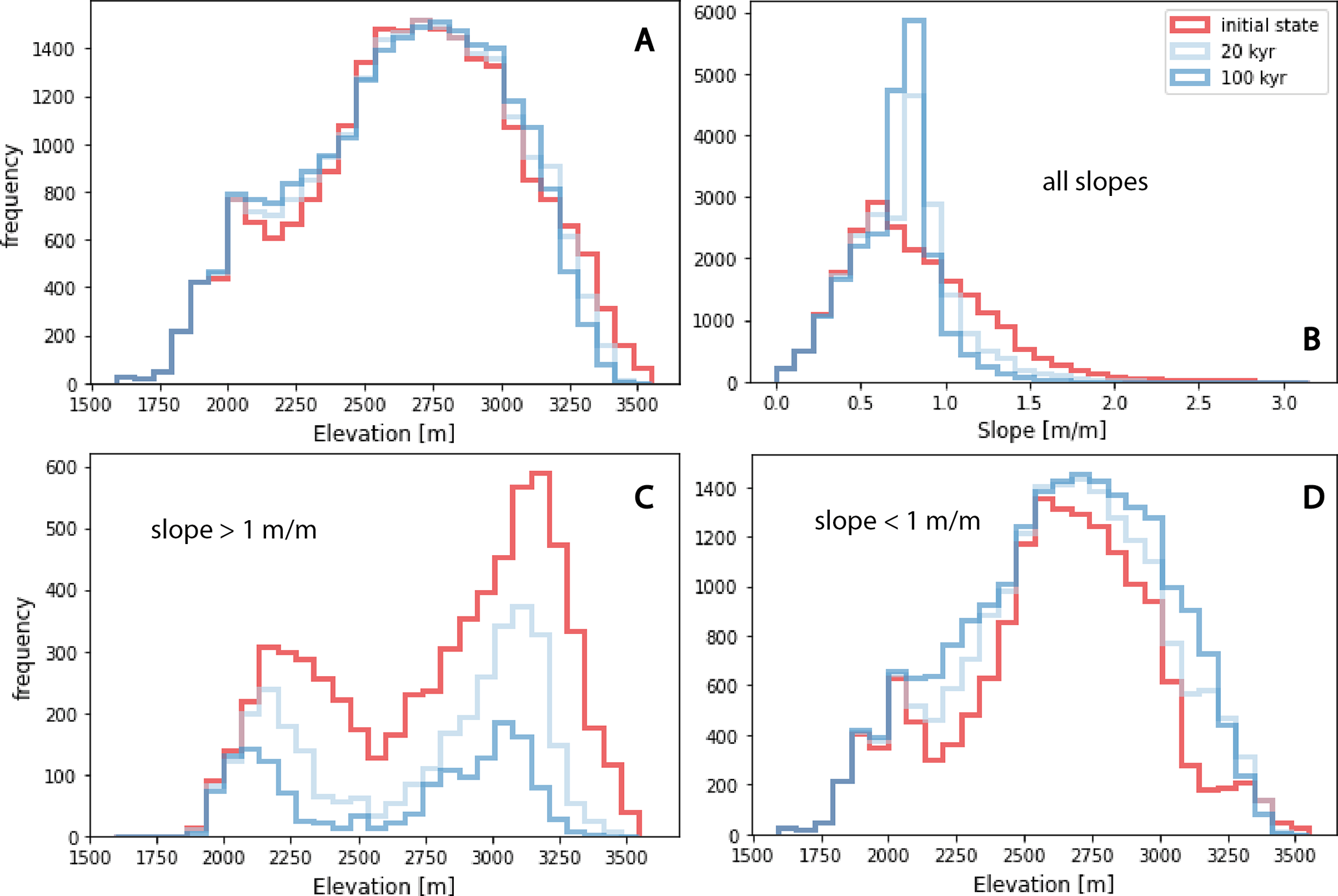 Figure 8For the Etages catchment (intermediate glacial-fluvial), temporal evolution of (A) elevation distribution, (B) slope distribution, and (C–D) elevation distribution with slope threshold values (above or below 1 m m−1). The colors illustrate the initial topography (red), an intermediate stage (20 kyr – light blue) and the final topography (100 kyr – dark blue).