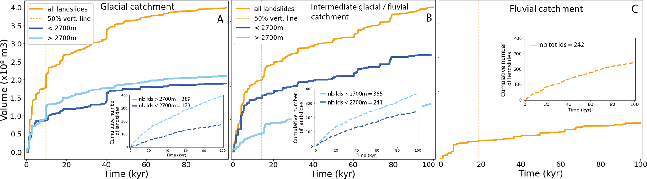 Figure 10Cumulative distribution of the predicted landslide volumes over the total simulation time (100 kyr) for the glacial (Pilatte – A), intermediate glacial/fluvial (Etages – B) and fluvial (Pisse – C) catchments. The orange lines are the total cumulative landslide volumes, while the blue lines display the predicted cumulative volumes for landslides located above (light blue) and below (dark blue) an elevation threshold of 2700 m. The yellow vertical dashed lines indicate the simulation time when 50 % of the total landslide volume is reached. Insets show the cumulative number of landslides generated during the simulation time for the two defined elevation classes.