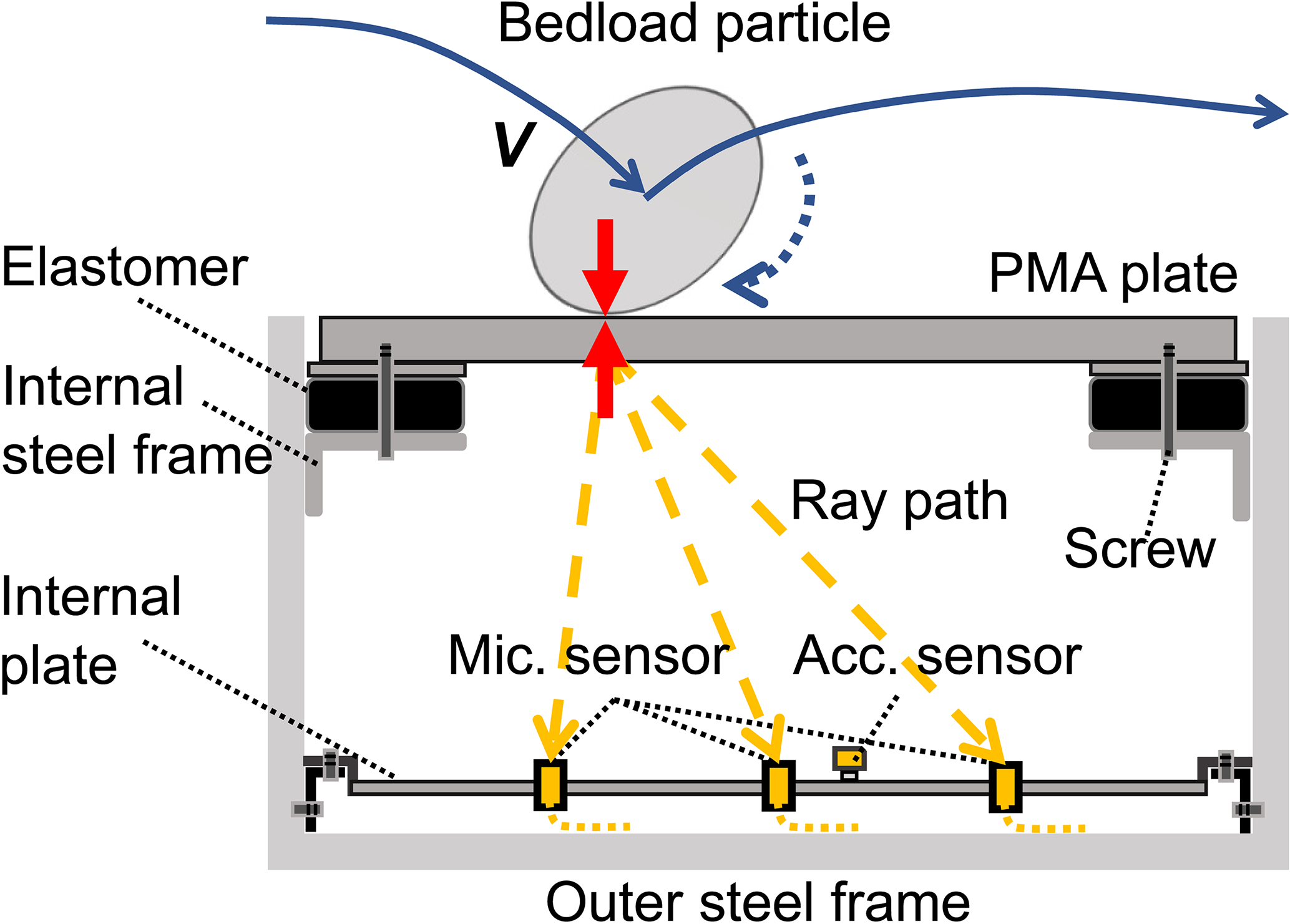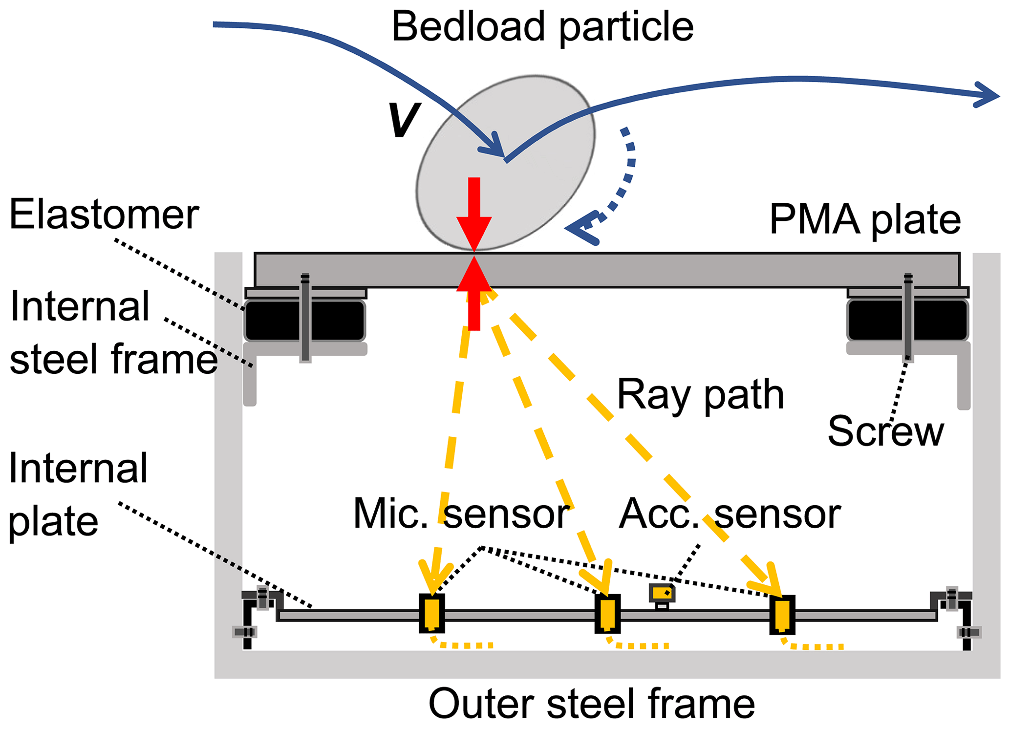 Figure 1Sketch showing a bedload particle impacting the PMA system plate at an impact velocity V. The yellow blocks represent the array of miniature microphone (Mic.) elements mounted on the internal plate of the PMA system. The acceleration (Acc.) sensor, which is fixed to the same plate, is also shown in yellow.