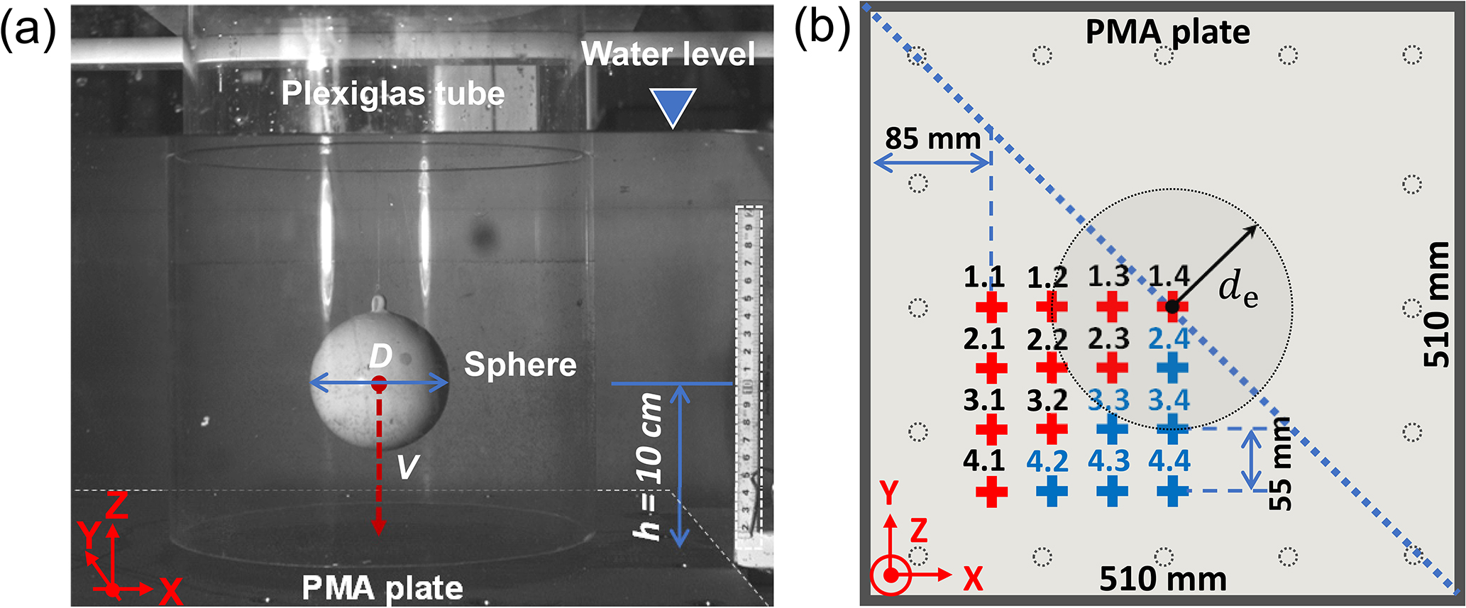 Figure 2(a) Side view of the dropping sphere during the laboratory experiments. (b) Design of the particle impact locations “+” on the plate of the phased microphones array (PMA) bedload monitoring system. The signal data generated by particles impacting on the locations coloured in red (1.1, 1.2, …, 4.1) was used for calibration, while the data generated by particles impacting on the locations marked in blue (2.4, 3.3, …, 4.4) was used for validation.