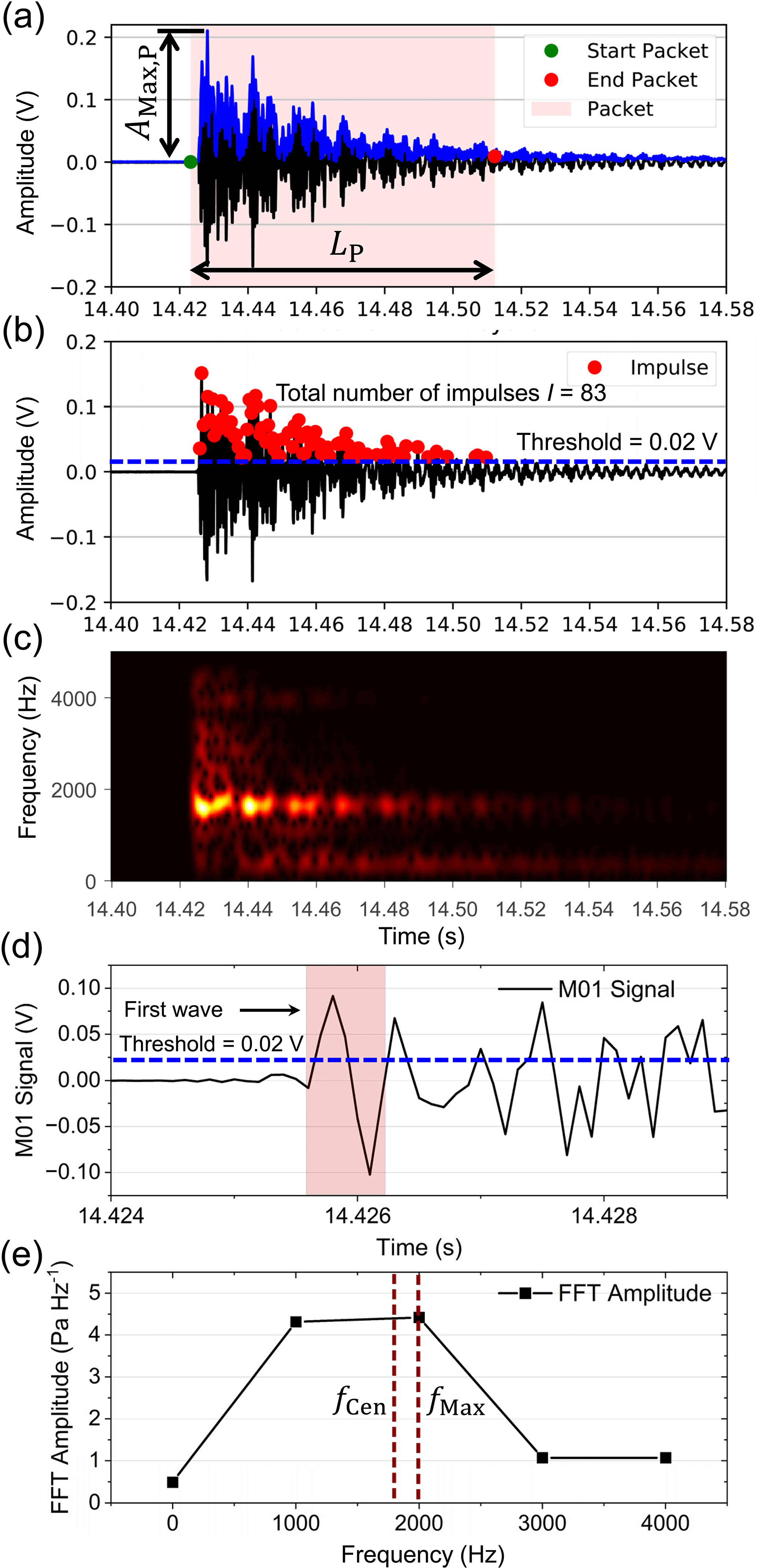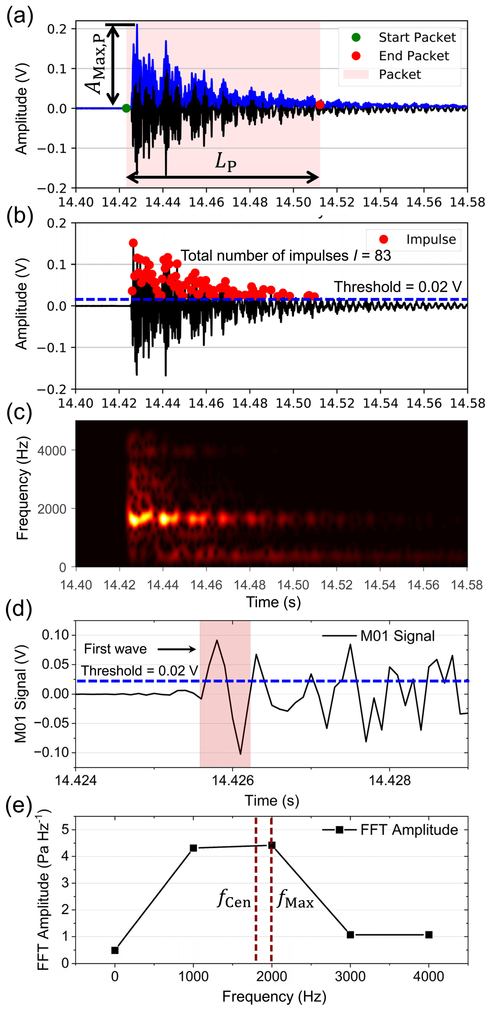 In the present study, we follow the above method to determine a packet of acoustic signals generated by a falling sphere impacting on the PMA plate. Based on the calculated packet, the positive maximum amplitude of the generated signal is defined as AMax,P in voltage (V) and the packet length (time duration) is determined as LP, as shown in Fig. 4a. In addition to studying the signal characteristics within an entire envelope, we also focus on the effective “first wave” of the signals, as its physical properties are more significant than the entire signal including reflection waves, as illustrated in Fig. 4d and e. The length of the effective first wave is approximately 1 to 2 ms, whereas LP typically lasts tens to hundreds of milliseconds.