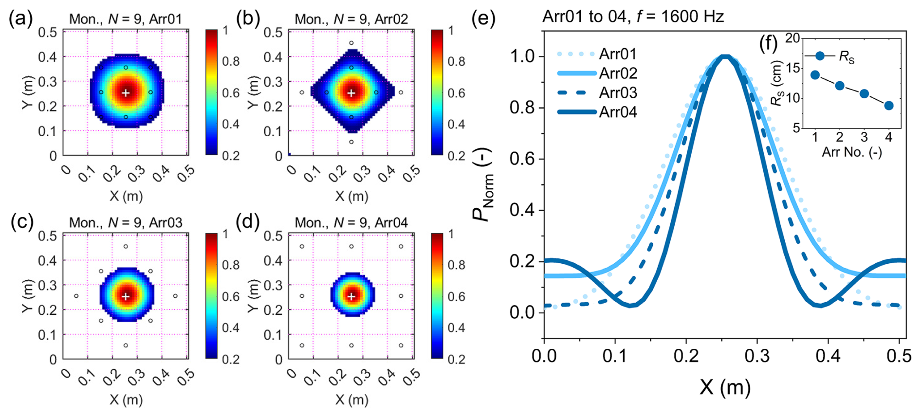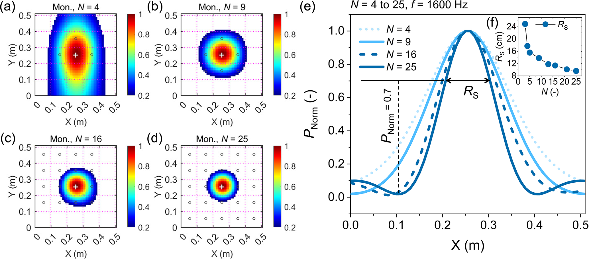 Figure 5The acoustic image and beam pattern determined with varied microphone element numbers N ranging from 3 to 25. (a–d) The acoustic images derived from the monopole source (Mon.) at the centric location of the PMA plate, obtained by using the beamforming technology with different numbers of microphones N = 4, 9, 16, 25, respectively. The microphone elements are marked with black circles. The colour bar indicates the non-dimensional acoustic intensity PNorm, representing the value of the reconstructed acoustic pressure normalized by the maximum amplitude at the centre of the acoustic image. (e) The corresponding beam patterns of N-sensor arrays when dMic = 100 mm and frequency f = 1600 Hz for monopole sources. (f) Resolution of the beam pattern RS as a function of N (ranging from 3 to 25). The emission coordinate (0.255, 0.255) is at the centre of the plane, as marked by the white cross “+”.
