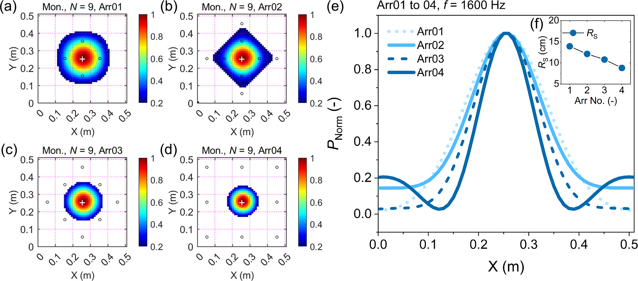 Figure 6The acoustic image and beam pattern determined with different microphone element arrangements. (a–d) The acoustic images for a monopole source determined with microphone element arrangements Arr01 to Arr04, respectively. The microphone elements are marked with black circles. (e) The beam patterns of the 9-sensor array for different element arrangements Arr01 to Arr04, with dMic = 100 mm and f = 1600 Hz for monopole sources, respectively. (f) Resolution of the beam pattern RS for Arr01 to Arr04. See the caption of Fig. 5 for details regarding the colour scale.