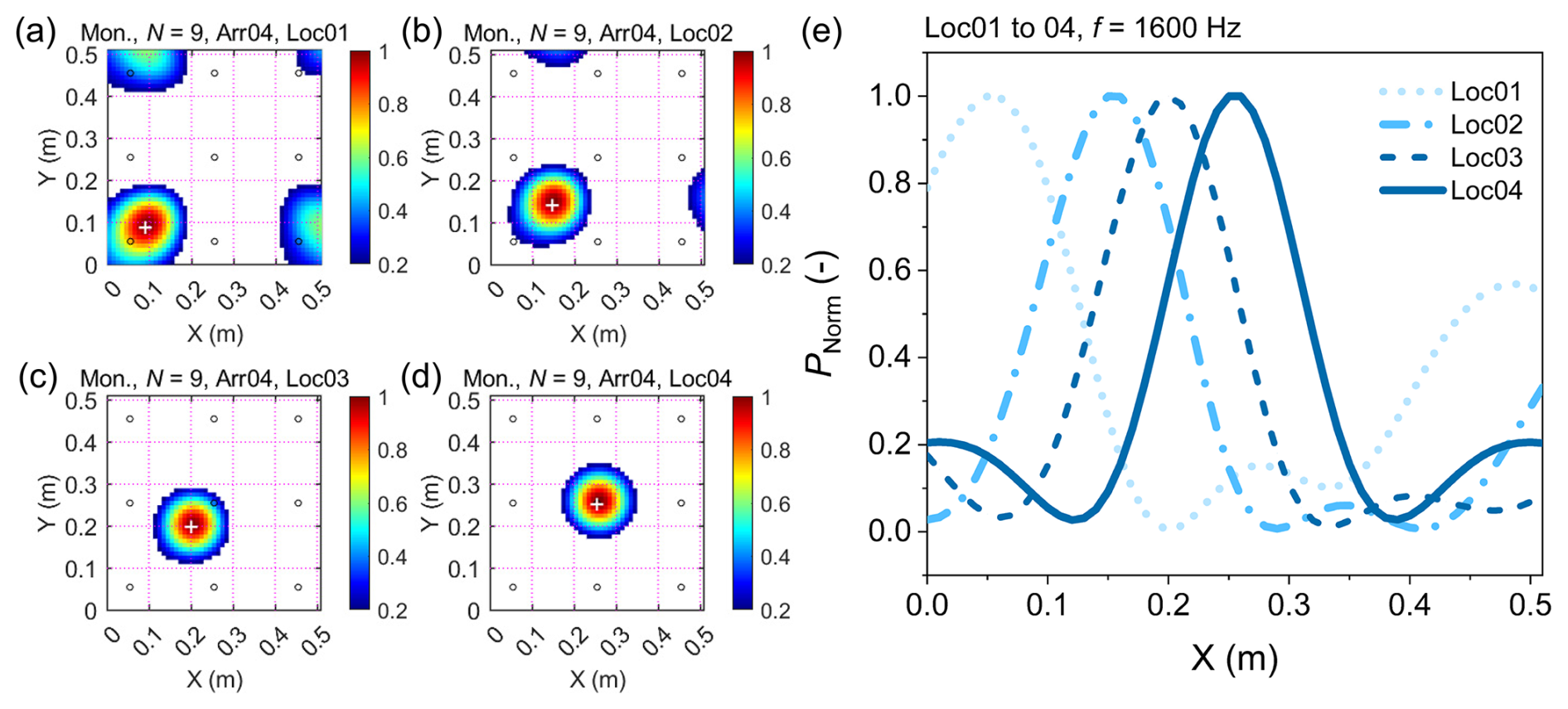 Figure 7 shows the reconstructed acoustic images of the sources generated with varying signal emission locations for monopole sources. The results of pressure distribution are displayed and normalized by the maximum amplitude of the main lobe. Figure 7a to d present the monopole source images under the condition of the emission coordinates (0.09, 0.09), (0.145, 0.145), (0.200, 0.200), and (0.255, 0.255), respectively. According to the results, the coordinates of the reconstructed acoustic source, corresponding to the centre of the red-black area, generally agree well with the locations of the emission signals. Figure 7e plots the beam pattern for a microphone array with nine sensors, dMic = 100 mm, and f = 1600 Hz, for different signal emission locations. The beam pattern consists of a total of three beams for the signal emission locations close to the boundary of the plate. The one with the maximum amplitude is the so-called main lobe and the rest are side lobes with relatively smaller amplitudes, as mentioned above. In contrast, the shape of the beam pattern changes, becoming more symmetrical as the emission location is moved from the boundary to the plate centre (0.255, 0.255). The simulation results also show that, as the emission source moves from the plate edge towards the centre, the amplitudes of the side lobes decrease significantly, centre indicating better spatial focusing and reduced side lobe interference in the reconstructed acoustic image.