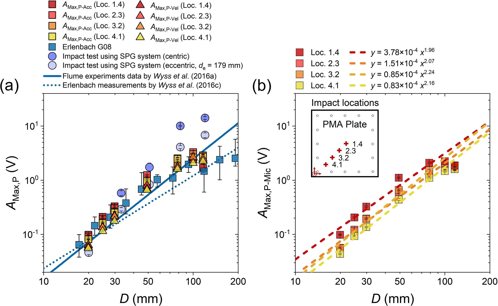 The maximum amplitude AMax,P-Acc of a packet recorded by the accelerometer increases with particle size D for both the centric (location 1.4) and eccentric (locations 2.3, 3.2, and 4.1) impacts, as shown in Fig. 8a. To make a direct comparison with the SPG system, we performed an additional calculation by integrating the acceleration signals to obtain the deformation velocity which can be then transformed into a voltage signal using the calibration coefficient (27.6 V m−1 s) of the SPG geophone. In Fig. 8a, the empirical relationship based on the laboratory flume experiments of Wyss et al. (2016a) and the results of the field experiments at the Erlenbach site with the SPG system (Wyss et al., 2016c) are presented for comparison with the AMax,P-Vel. AMax,P-Vel indicates the maximum packet amplitude in voltage, which is derived from the velocity signals integrated from accelerations in the Z direction, using the SPG system geophone's calibration coefficient. An increasing trend can be observed for the AMax,P-Mic data recorded by the microphone element M05 (Fig. 8b). All measurements show a generally larger amplitude triggered by centric impacts compared to that induced by eccentric impacts, except for the largest particles with D = 116.4 mm. The differences between the centric and eccentric impacts also show an increasing trend with increasing particle size (up to size class 6).