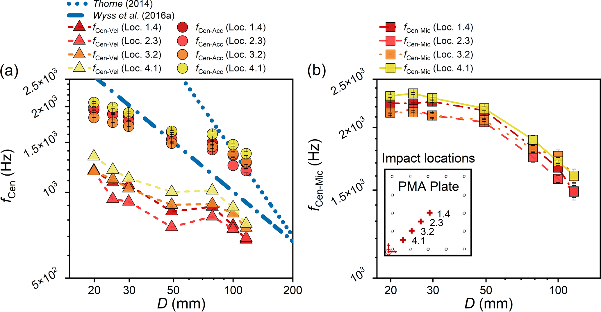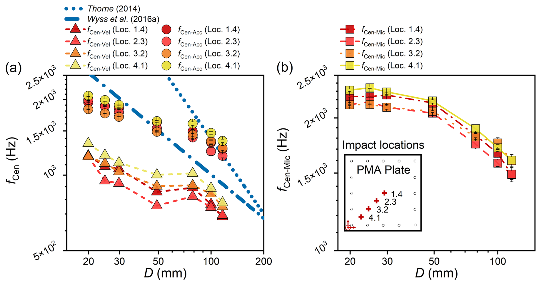 Figure 10Relationship between the centroid frequency fCen of the generated signals and the sphere diameter D for variable impact locations. (a) fCen−Acc and fCen−Mic calculated from acceleration vibrations in the vertical direction. The triangle dots in panel (a) indicate the centroid frequency values calculated from the velocity signals integrated from the vertical accelerations using a threshold value of 0.1 V. In panel (b), the centroid frequency of the microphone signals (recorded by the microphone sensor M05). The data generated by particles impacting the plate at the locations (1.4, 2.3, 3.2, and 4.1) indicated by colours from red to yellow.