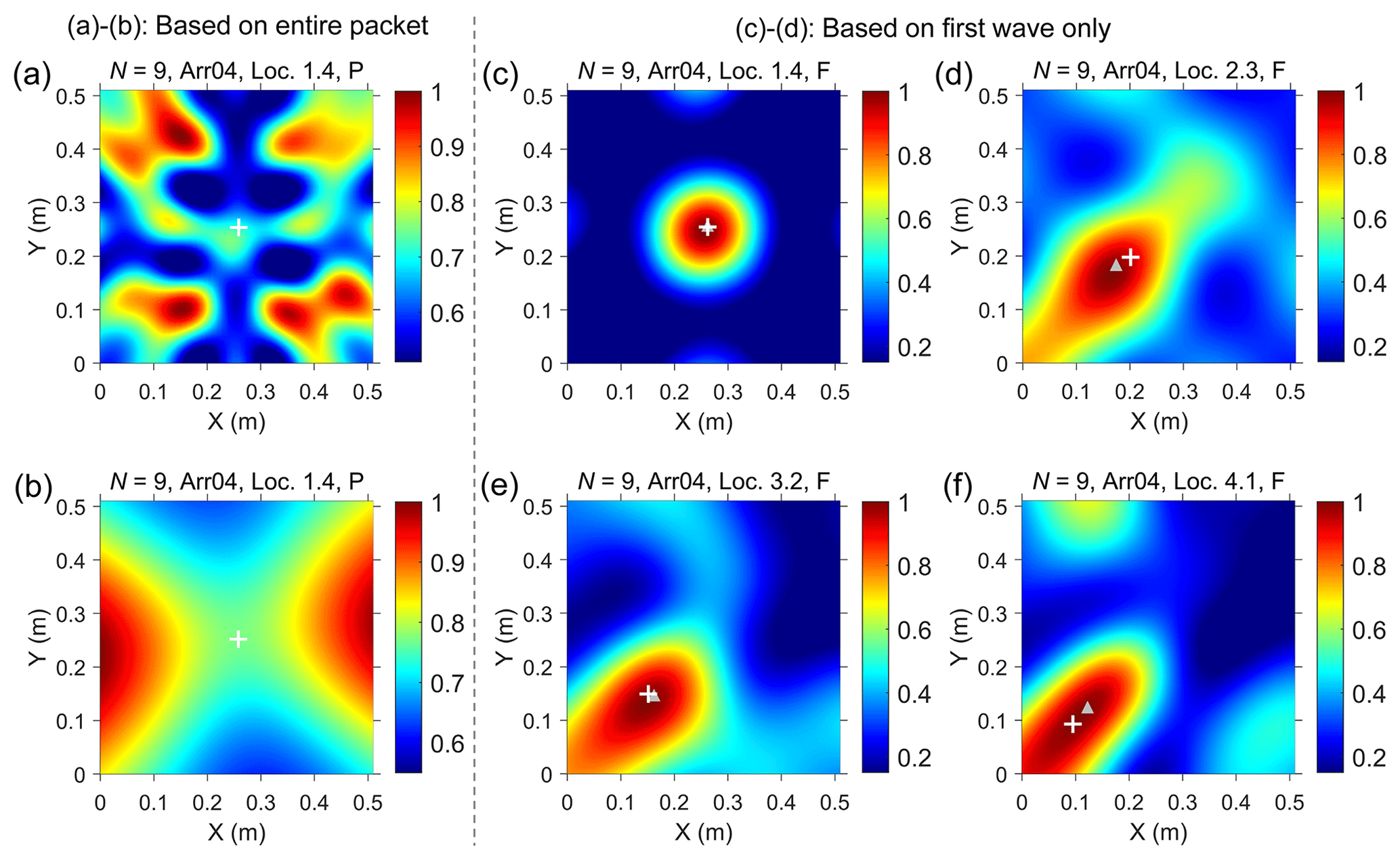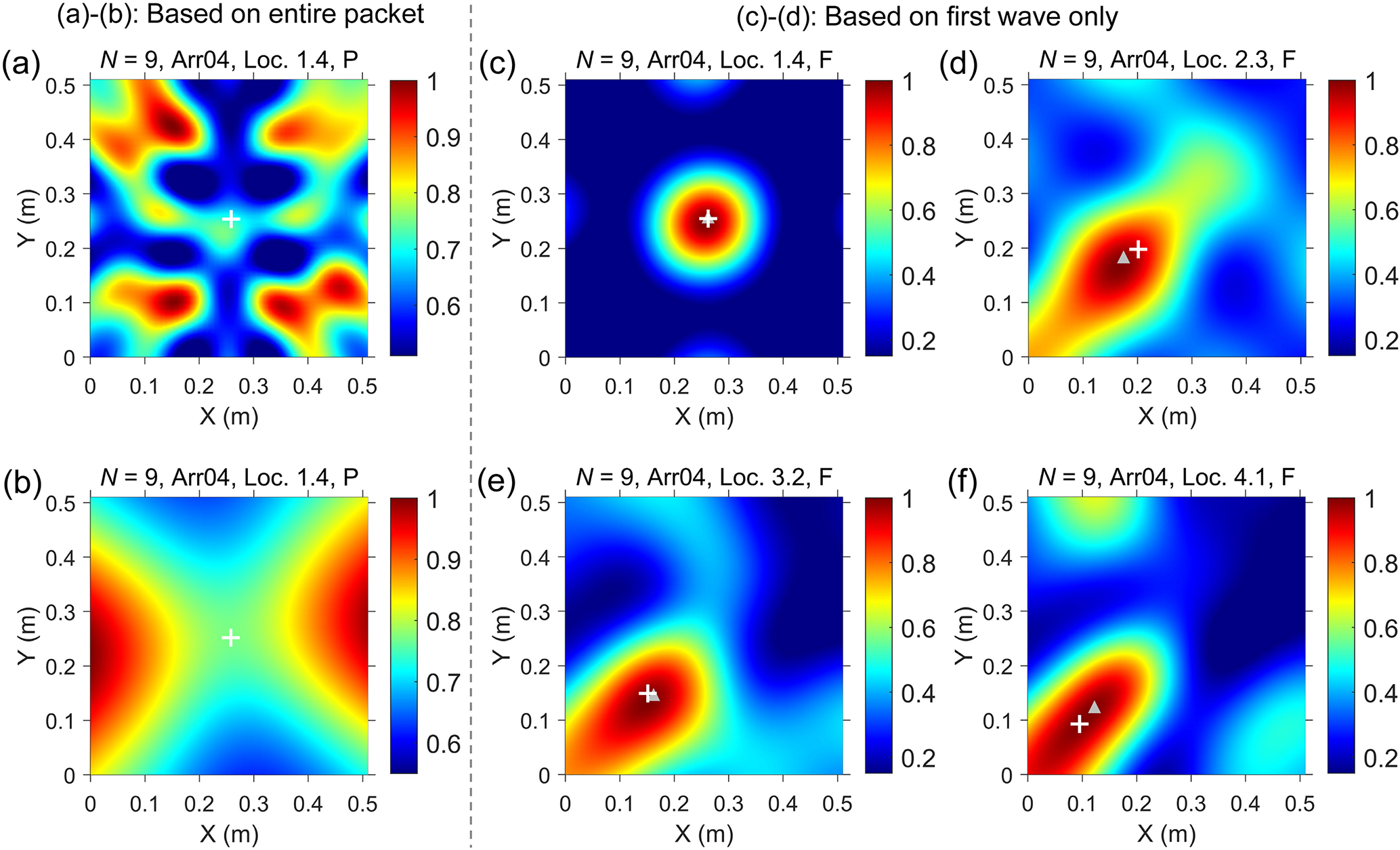 Figure 11The acoustic image of a monopole source triggered by eccentric and centric impacts. (a, b) The results obtained with the centroid (a) or peak (b) frequency as the frequency of interest in the calculation process, using the signals within the entire packet “P” generated by a particle impact at the centre of the plate “Loc. 1.4”, marked by the white cross “+”. (c) The results which are calculated using only the signal of the first wave “F” from the microphone array. (d, e, f) The acoustic images are determined using experimental signals (the first wave) for eccentric impacts, e.g. Loc. 2.3, Loc. 3.2, and Loc. 4.1, respectively. The gray triangles in panels (c) to (f) indicate the acoustic centres calculated from the model. The colour scale indicates the non-dimensional acoustic intensity.