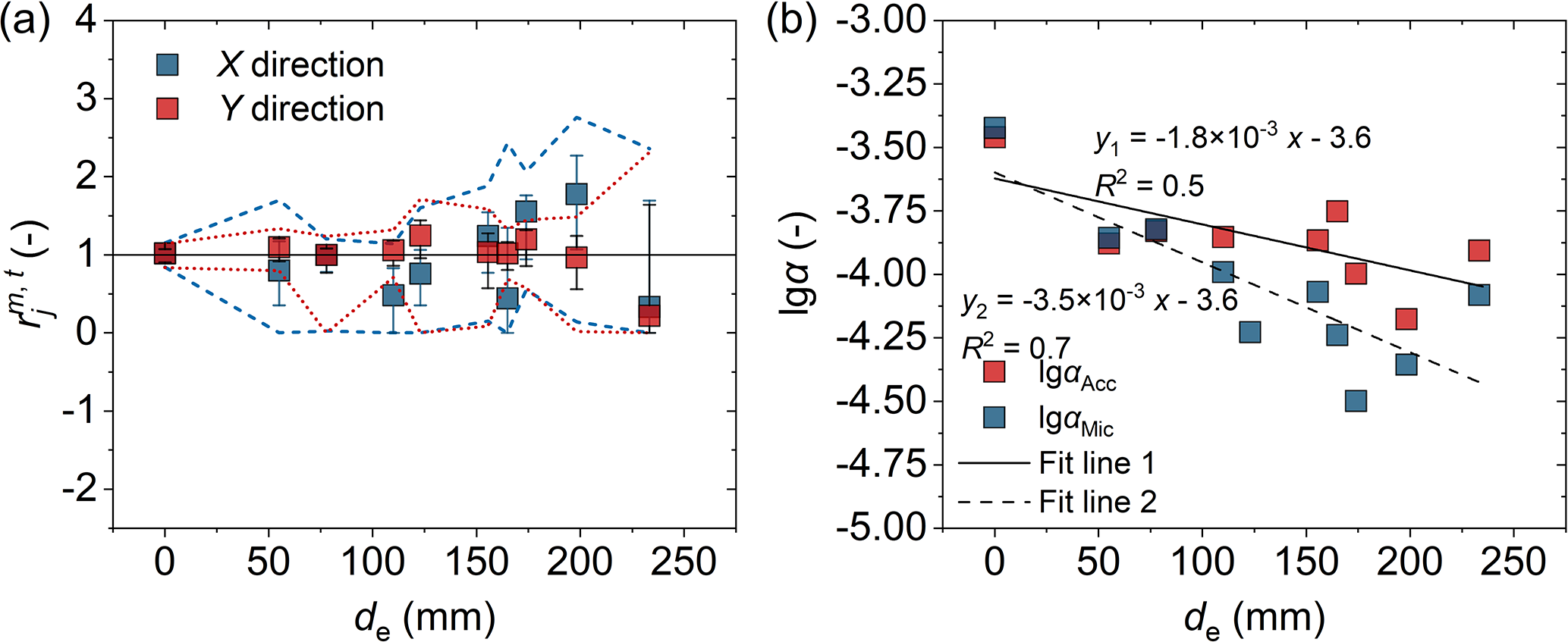 Figure 12The ratio of the coordinates of a particle impact location and lgα as functions of the eccentricity distance de. (a) The ratio was calculated based on acoustic images by the model inversion to the true coordinates of the sphere impact location for particle size class j = 4. The boxes in blue and red are the results for the X and Z directions, respectively. The dashed/dotted lines and the error bars indicate the beam pattern resolution that covers a range of 30 % and 10 % below the peak value, respectively. (b) The values of lgα calculated from the data presented in Table 3, and by fixing the exponent β of the power law relation between AMax,P and D.