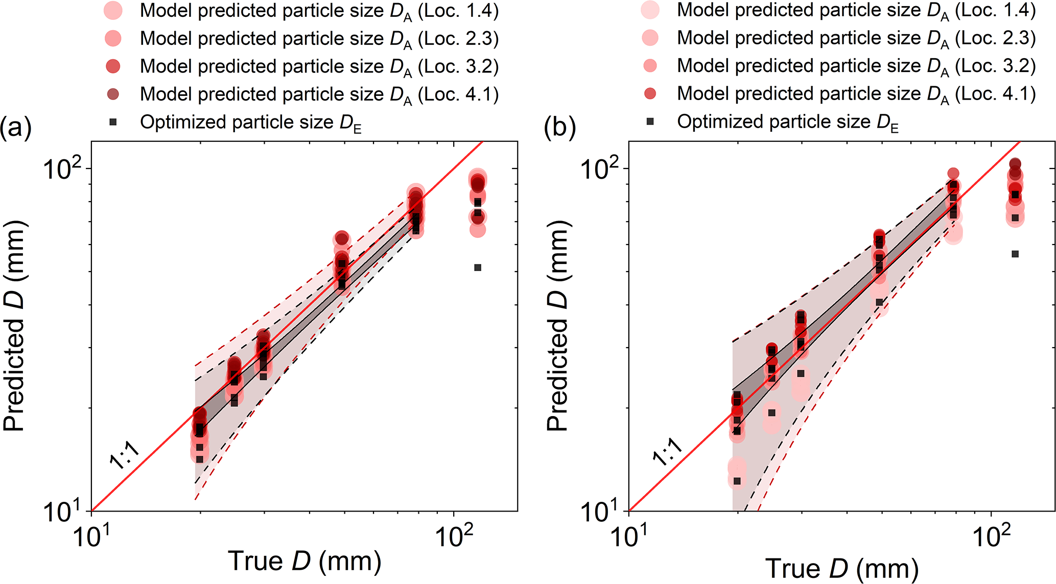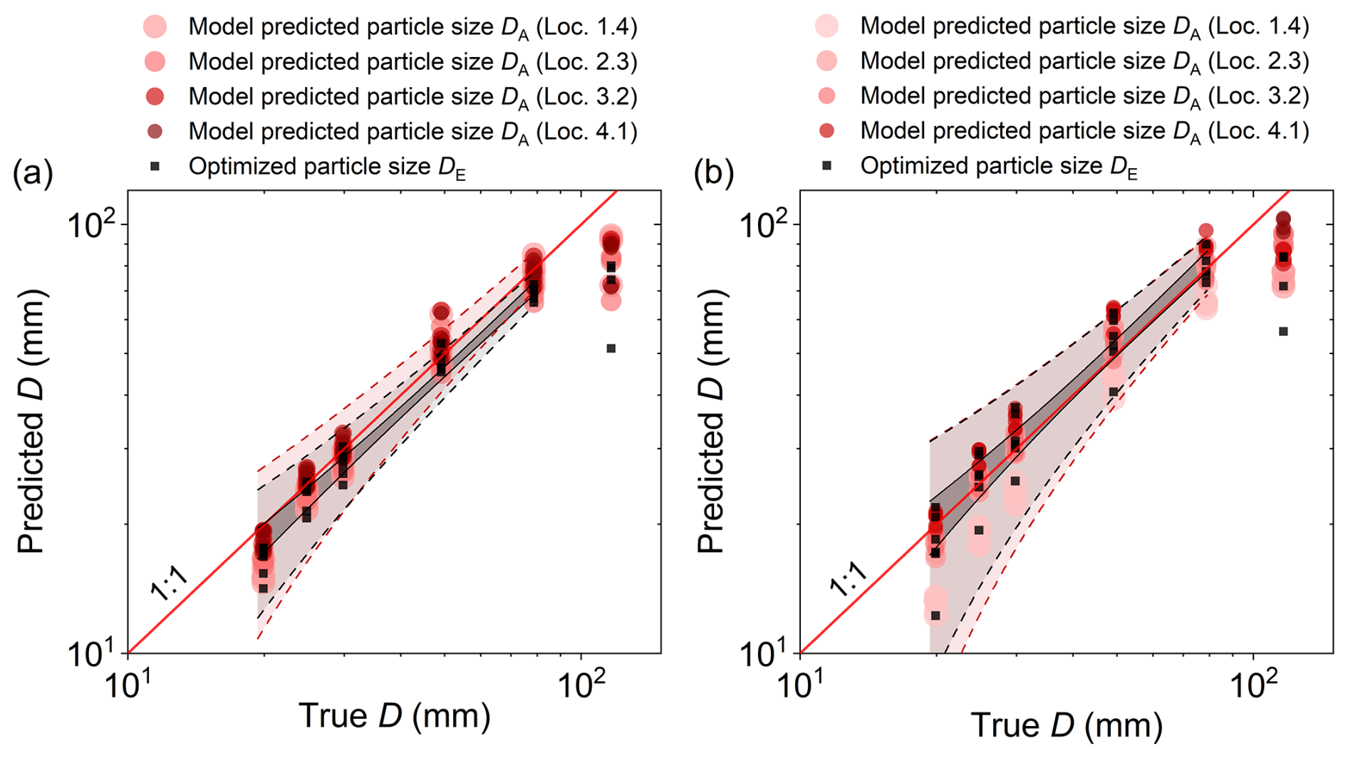 For a better comparison between the optimized and the non-optimized predicted particle sizes, the packet amplitudes resulting from eccentric impacts (e.g., impact at 2.4, 3.4, …, 4.2) were employed for the computation of particle size DA. This was achieved using variable calibration relationships, employing the original values of α, which were determined at different impact locations (1.4, 2.3, 3.2, and 4.1).