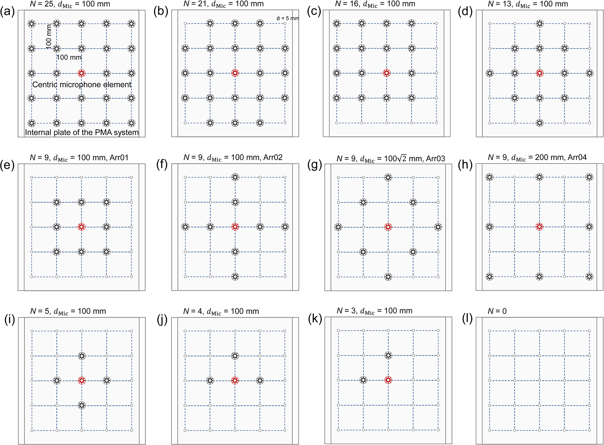 Figure 3a displays an array with N = 9 microphone elements, where the number of elements and the spacing, dMic, are mutually constrained because the structural dimensions of the PMA system have been predetermined. Hence, the planar dimensions of the PMA in terms of its length LPMA and width WPMA control the distribution range of the microphone element arrays, while the height HPMA constraints the wave propagation distance from the sound source to the element arrays.