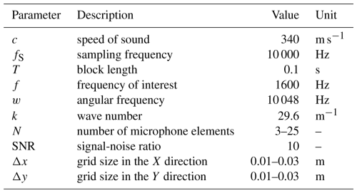 Table 2Characteristic parameters of the sound source used for numerical simulations, including sound speed c, sampling frequency fS, block length T, frequency of interest f, angular frequency w, wave number k, number of microphone elements N, signal-noise ratio SNR, grid size in the X and Y directions, Δx and Δy respectively.