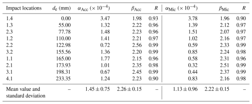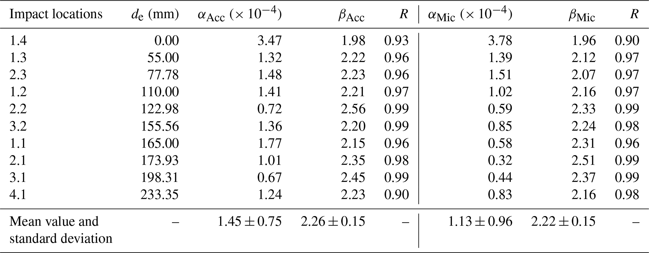 Table 3The coefficients in the power functions determined between the maximum amplitudes of the acceleration and microphone signals with particle size. The fitting utilized signal data generated by particle impacts at various positions on the PMA plate, with the eccentricity distance de ranging from 0 to 233.4 mm. The coefficients αAcc and βAcc presented in Table 3 indicate the values obtained from the vertical acceleration signals, while the coefficients with the subscript “Mic” were computed from the microphone (sensor M05) signals.