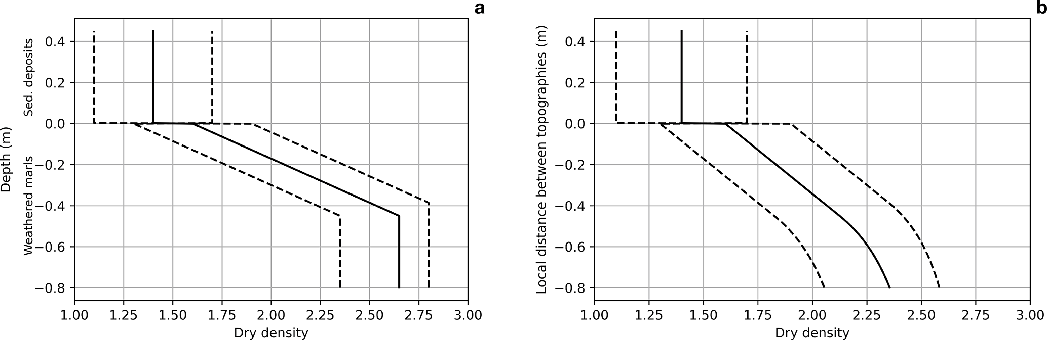 Figure 4a shows the resulting model. In order to incise a layer at a given depth, the upper layers must first be eroded. Thus, at a given local distance h⟂ measured between the local surfaces of two surveys corresponds an effective density , shown on Fig. 4b. By construction, the resulting profile is framed by two variations of ±0.3 g cm−1 at a given depth, thus providing an upper and lower bound that estimates the associated extended uncertainties. However, this model does not account for the spatial variability of marl deposition and weathering profiles by design.