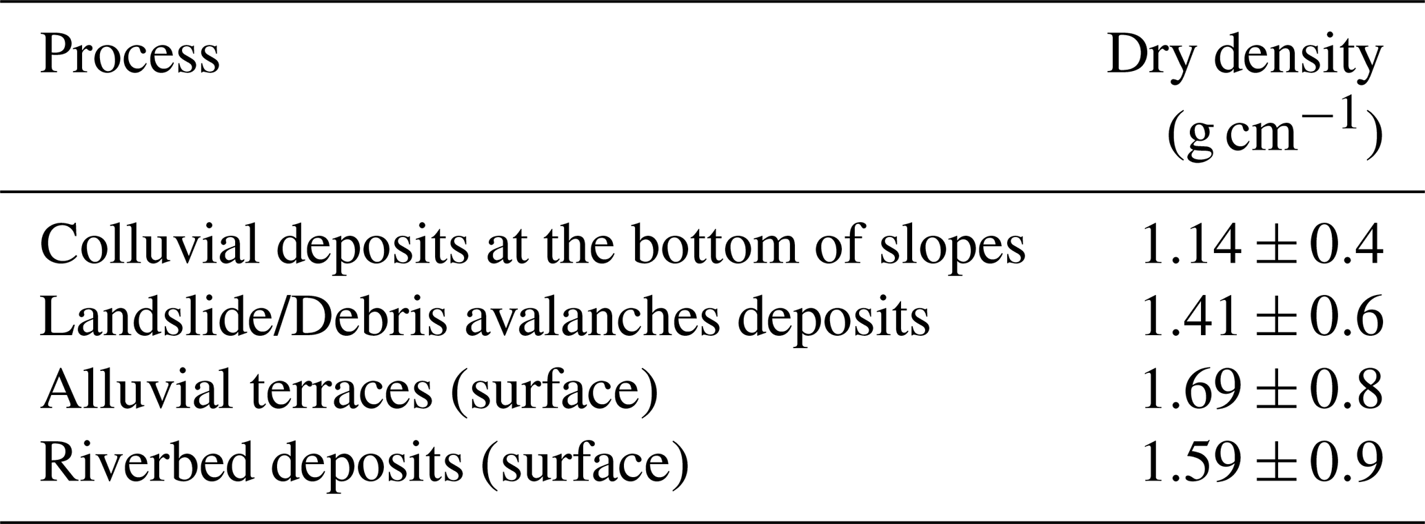 We have therefore developed a simplified bulk density model based on sediment deposit measurements and marl weathering profiles from other studies. As shown in Sect. 2.3, the dry bulk density of sediment deposits varies considerably due to geomorphological processes. However, for practical purposes, a mean constant value of 1.40 ± 0.3 g cm−3 is adopted here. For eroded materials, our model should reflect the marl weathering profile, which varies significantly with depth, as demonstrated by Maquaire et al. (2002) and Rovéra and Robert (2006). The compact marl horizon is typically located at a depth of around 45 cm with a material density reaching up to 2.65 g cm−1 (Lavergne, 1986; Mathys, 2006; Serratrice, 2017). This is overlain by a stratified regolith that is progressively weathered towards the surface, where the density varies seasonally: it reaches a minimum of (1.39±0.2) g cm−1 in winter due to frost-cracking and a maximum of (1.76±0.2) g cm−1 in summer when it is exposed to transport processes during seasonal storms (Ariagno et al., 2023). Accordingly, we define a linear density profile of eroded materials with depth, ranging from 1.6 ± 0.3 g cm−1 at the surface to 2.65±0.3 g cm−1 (not exceeding 2.8 g cm−1) at 45 cm, beyond which it is assumed to be constant.
