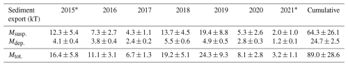 The hydro-sedimentary records are available on the observatory's website (Le Bouteiller et al., 2024). From the discharge and suspended sediment concentration, and the volumes scoured from the sediment trap, converted to tonnes at the measured density of 1.7 g cm−1 (Klotz et al., 2023), we can estimate the total sediment export Mtot. at the station. Table 3 summarises the annual and cumulative export over the sequence, with expanded uncertainties calculated using the quality codes assigned by Klotz et al. (2023, see Appendix B for details). The cumulative export totals 89.0 ± 28.6 kT between April 2015 and June 2021.