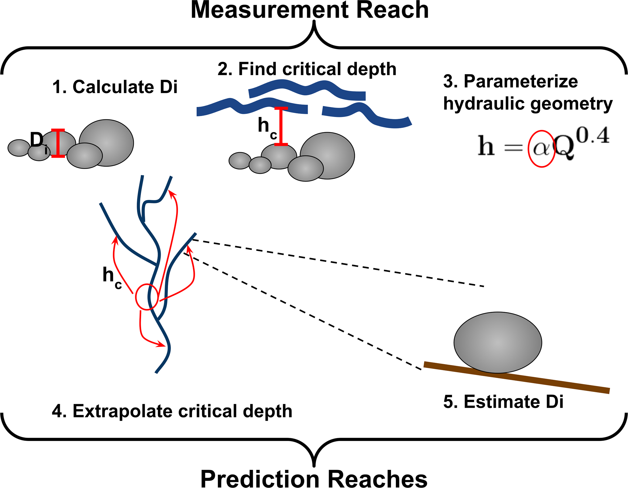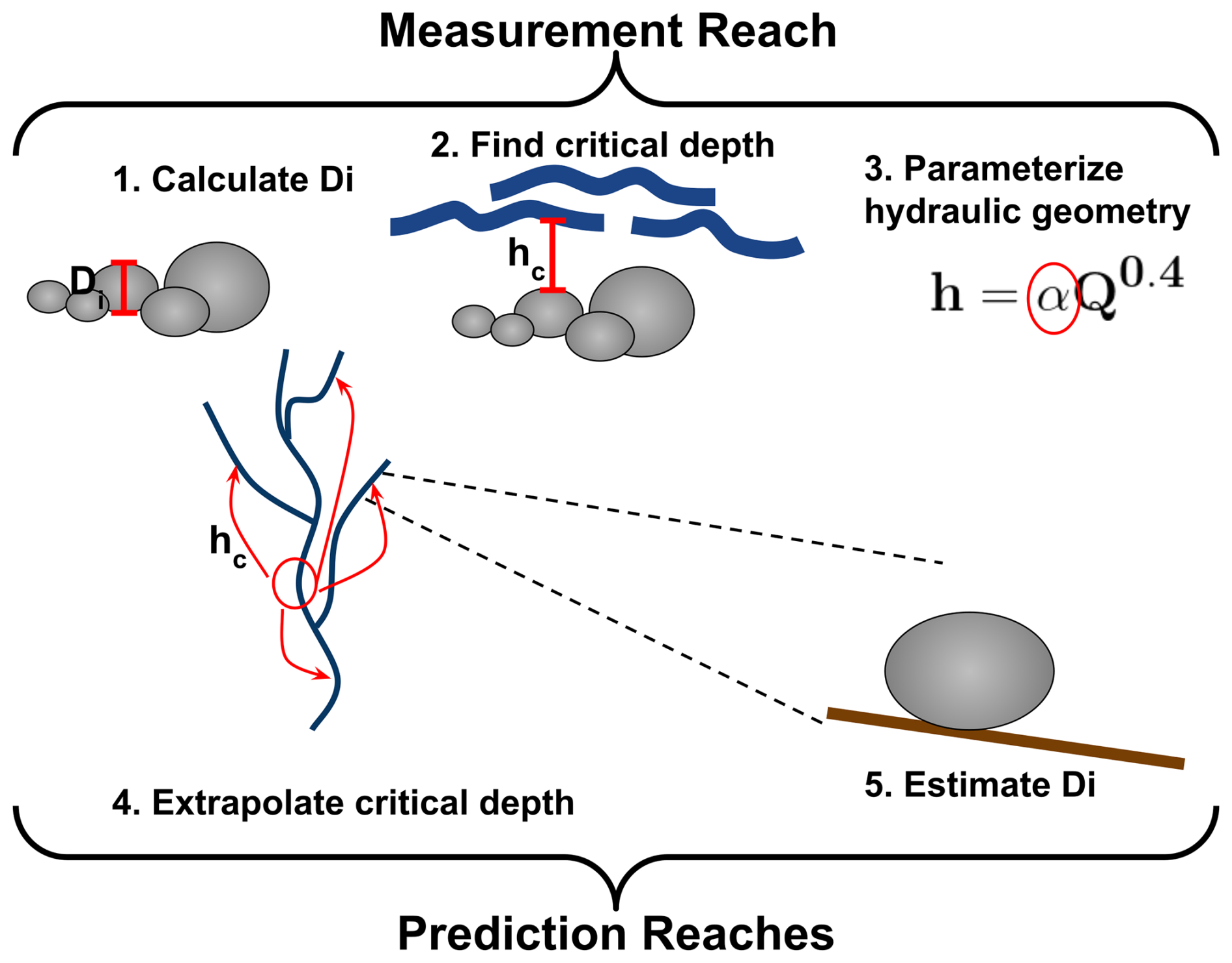 Figure 1A graphical representation of the algorithm for predicting grain sizes at all reaches of a drainage network using measurements from a single reach. D16, D50, and D84 are calculated from a pebble count (1) at a measurement reach, the critical depth for that grain diameter estimated (2), and hydraulic geometry coefficients for that depth calculated (3). That coefficient is used to extrapolate critical depth to the remainder of the drainage network (4), and used in a rearrange Shield's Equation to estimate the corresponding grain size at every reach of the drainage network (5).