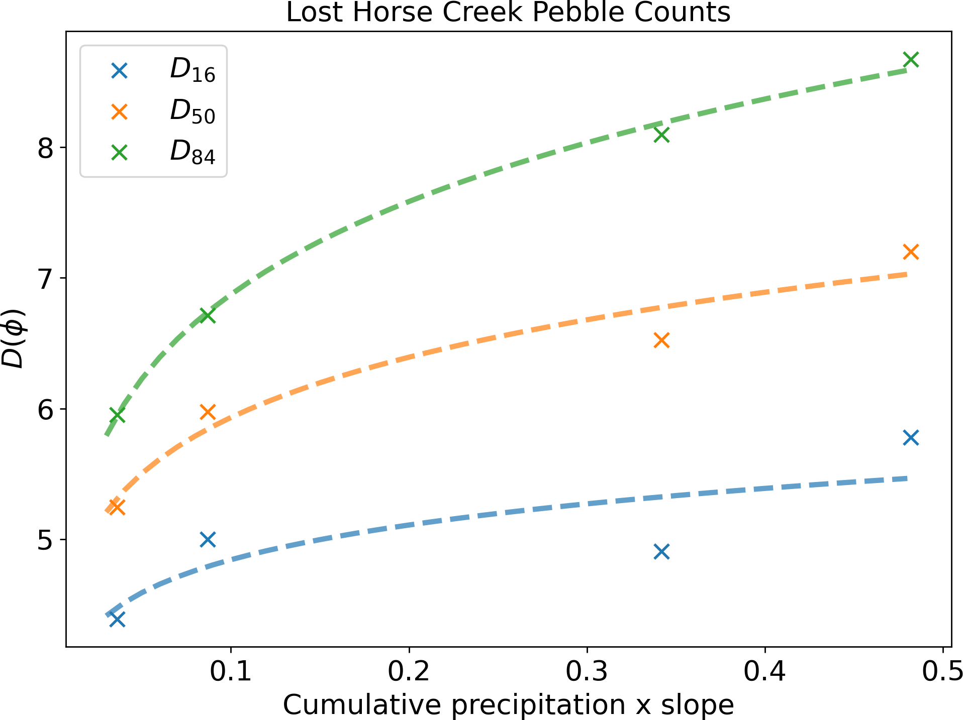 Figure 2Parameterized relationships (lines) for calculating D16, D50, and D84 as a function of the product of slope and flow using four pebble counts at different locations within a single basin in the study area. In this application, I used precipitation within the upstream basin as the flow proxy, therefore the x axis is the product of these precipitation values and the reach-averaged slope.