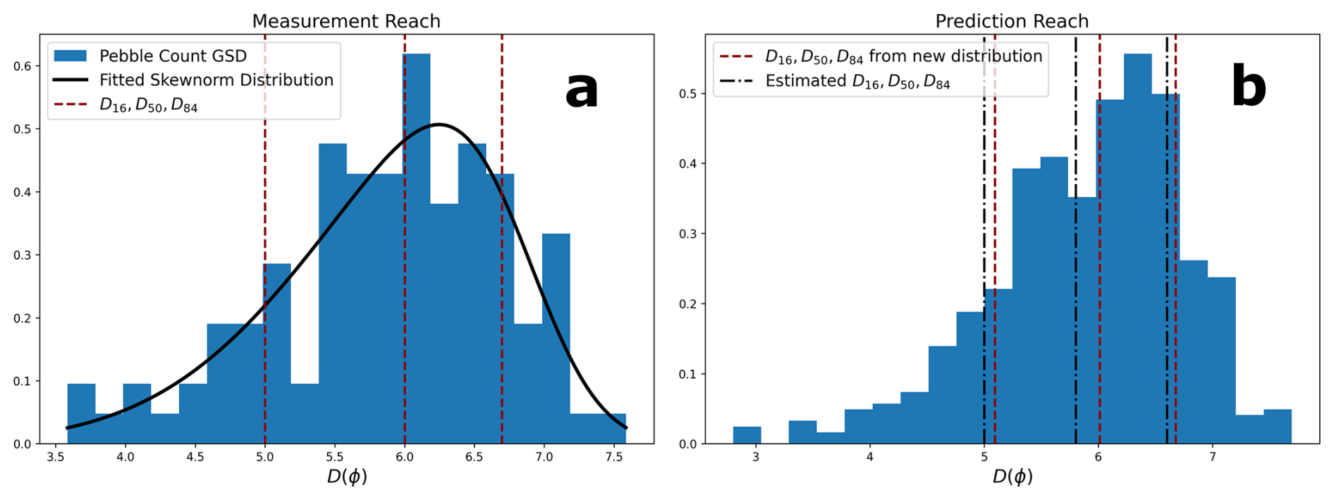 Figure 3Pebble count measurements are used to fit a skew-normal distribution and calculate its parameters (a). Those parameters are then used to generate new distributions in non-measurement (prediction) reaches (b). The parameters are then adjusted until the errors between D16, D50, and D84 from newly generated distributions and previously predicted values for D16, D50, and D84 are minimized.