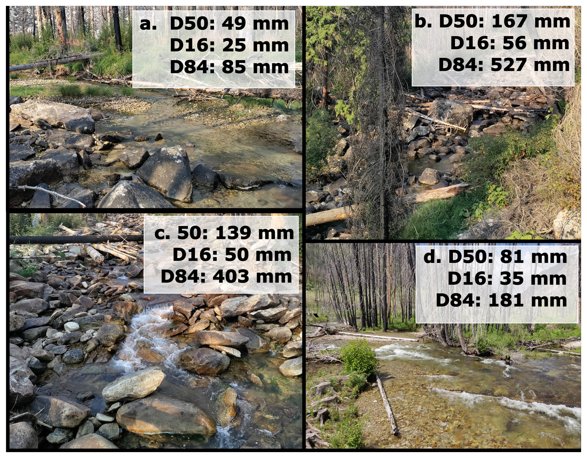 Figure 6Photographs along different reaches of Roaring Lion Creek with the predicted D16, D50, and D84 values.