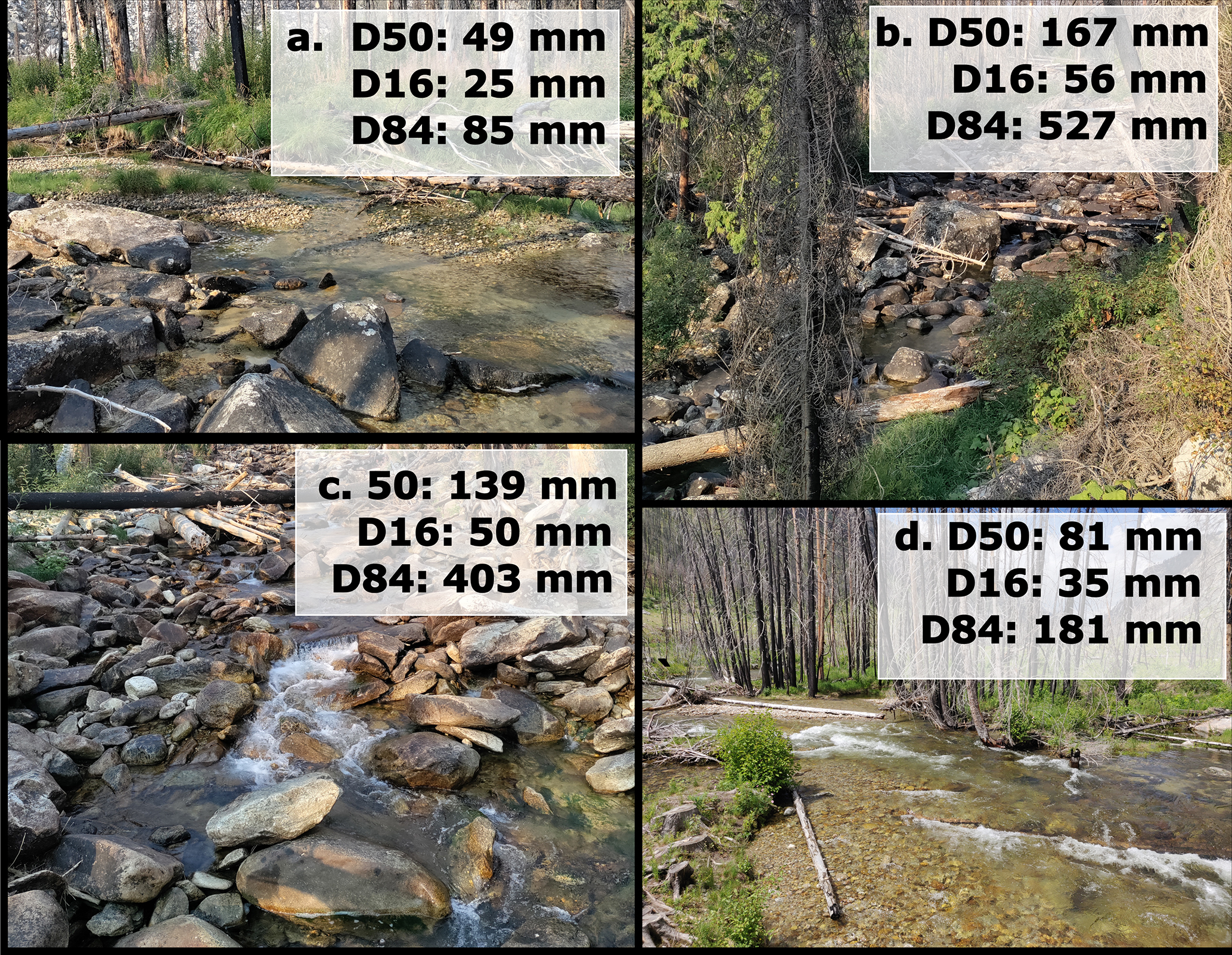 Several approaches have been used to estimate grain size across large spatial extents. Jha et al. (2022) assessed D50 at over 2400 locations from five different sources and used inverse distance weighted interpolation to estimate D50 regionally between sample points. This provides broad regional patterns, but does not provide information in specific catchments or reaches. Abeshu et al. (2022) attributed D50 information from 2577 United States Geologic Survey (USGS) gages to corresponding reaches in the National Hydrography Dataset (NHD) and used machine learning to develop a model based on the attributes available in the in NHDPlus dataset, finding that slope and distance between the reach and the stream's mouth were the most important channel characteristic predictors of grain size. Similarly, Snelder et al. (2011) used random forest models to assess data from 677 stream reaches in France with grain size measurements and found that the model incorporating variables related to hydraulic sorting (e.g., slope and precipitation) best predicted D50.