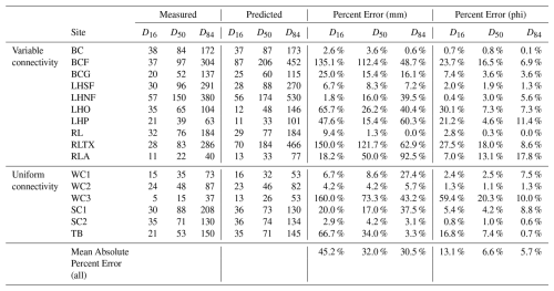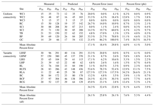 For model results using multiple pebble count measurements for calibration (Table 1), the average discrepancy between predicted and measured size was 6 mm for D16, 14 mm for D50, and 32 mm for D84, or mean absolute percent error (MEAP) of 26.1 %, 25.8 %, and 26.1 % respectively. In comparing predictions to measurements in the phi scale, this equates to MEAP of 7.6 % for D16, 5.3 % for D50, and 4.4 % for D84. All combined, the MEAP for phi values was 5.8 % (26 % for mm). With the exception of D84, which had similar error in both cases, errors were lower for the uniform group (6 %, 4.1 %, and 5 % MEAP for phi values) than for the variable group (9.1 %, 6.4 %, and 3.9 % MEAP for phi values).