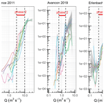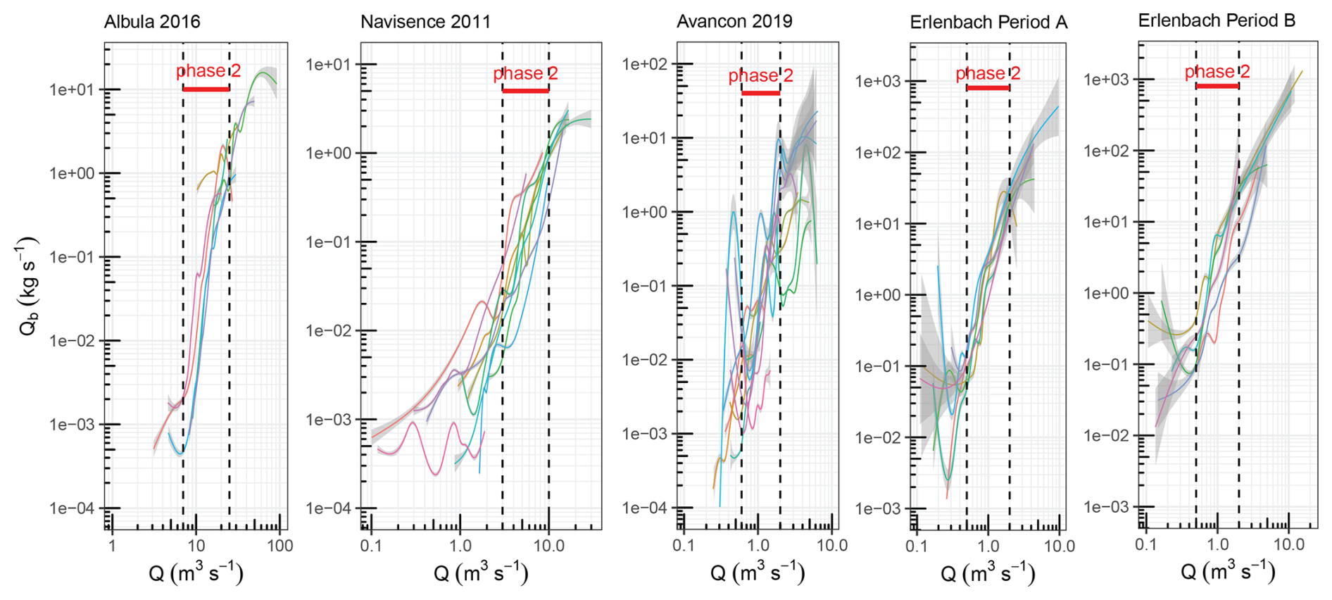 A closer inspection of the mean bedload transport relations over limited time periods, namely for two-week periods for the first three streams, showed that these relations varied over time within an intermediate flow range including phase-2 transport conditions. For each stream the phase-2 conditions suitable for this analysis were determined by visual inspection of the smoothened trend lines. There is not much quantitative guidance in the literature regarding the definition of phase-2 transport conditions. Bathurst (2007, Eqs. 8, 9, therein) proposed two empirical equations for the begin of phase-2 transport in mountain streams, Qc2a as function of S and D50, and Qc2b as function of S and D84, and I have included these two estimates in Table 3. A comparison with the values in Table 3 indicates, that some of these estimates approximately agree for two streams (Avancon, Qc2a; Erlenbach, Qc2b) with my values determined from the direct transport measurements.