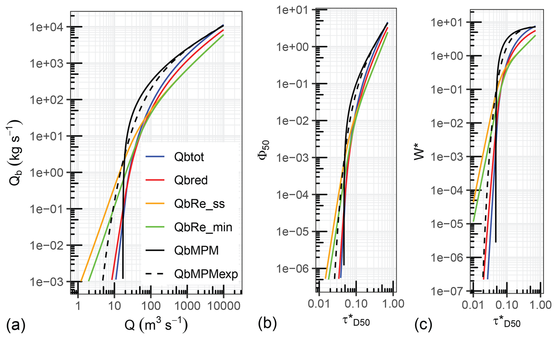 The dimensionless reference shear stresses used for the further calculations in this study are summarized in Table 3. Here, the two forms of the MPM equation (Eqs. 20, 22) are applied only to the Albula site. The bedload transport rates over the entire channel width are labeled QbMPM for Eq. (20) and QbMPMexp for Eq. (22). The aim is to illustrate how all the bedload transport equations presented above compare with each other, when applied to a given site. For the Albula site, = 0.0469 is used (from Eq. 4); for the traditional form of the MPM Eq. (20), in combination with Eq. (23), = 0.996 = 0.996 = 0.0467 is used. This value is rather close to the traditional value of = 0.047 often used with the MPM equation. The comparison of all six bedload transport equations applied to the Albula site is shown in Fig. 2.