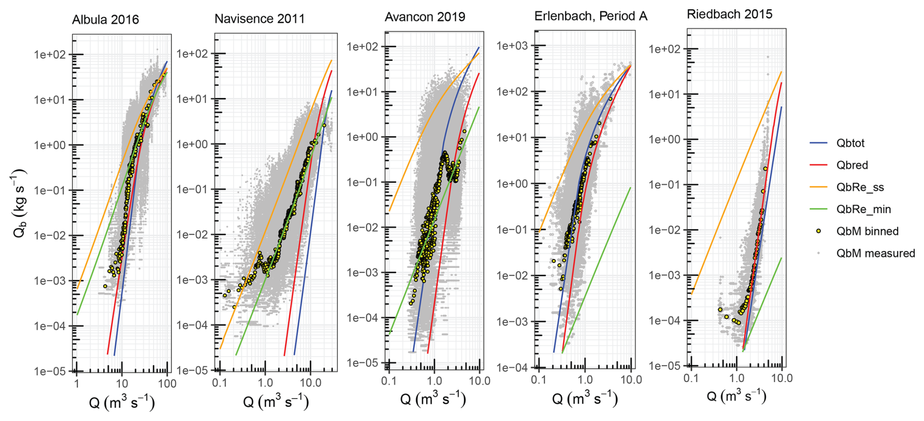The data sets for the Riedbach (Schneider et al., 2016), the Erlenbach (Rickenmann, 2020, 2024), and the Avançon (Antoniazza et al., 2022) were already published and are available online in the EnviDat repository: https://doi.org/10.16904/envidat.459 (Rickenmann et al., 2020b, 2023). The bedload transport data for the Albula 2016 and for the Navisence 2011 are available online in the EnviDat repository under the same link.