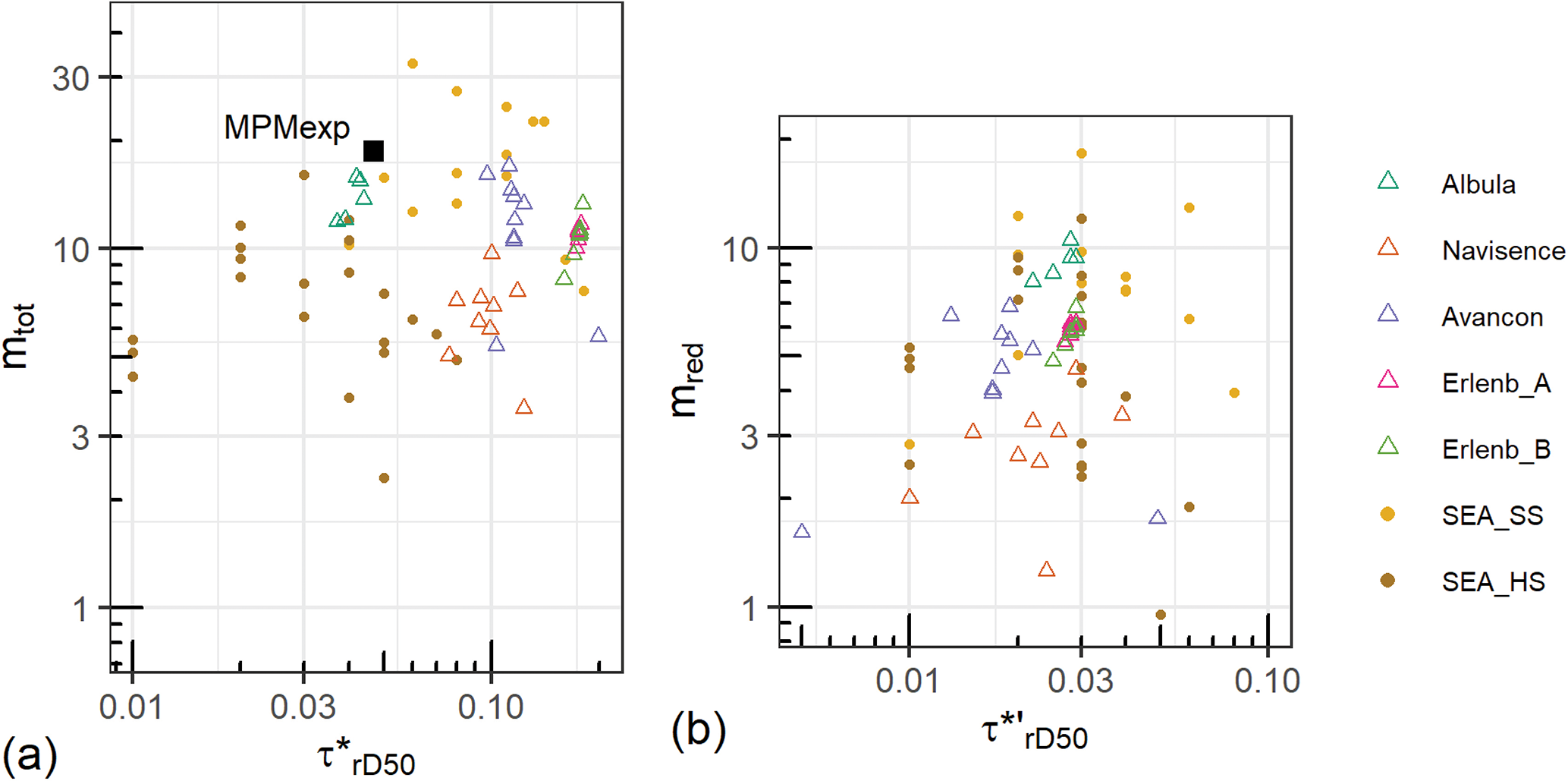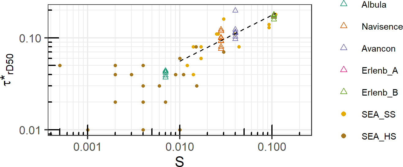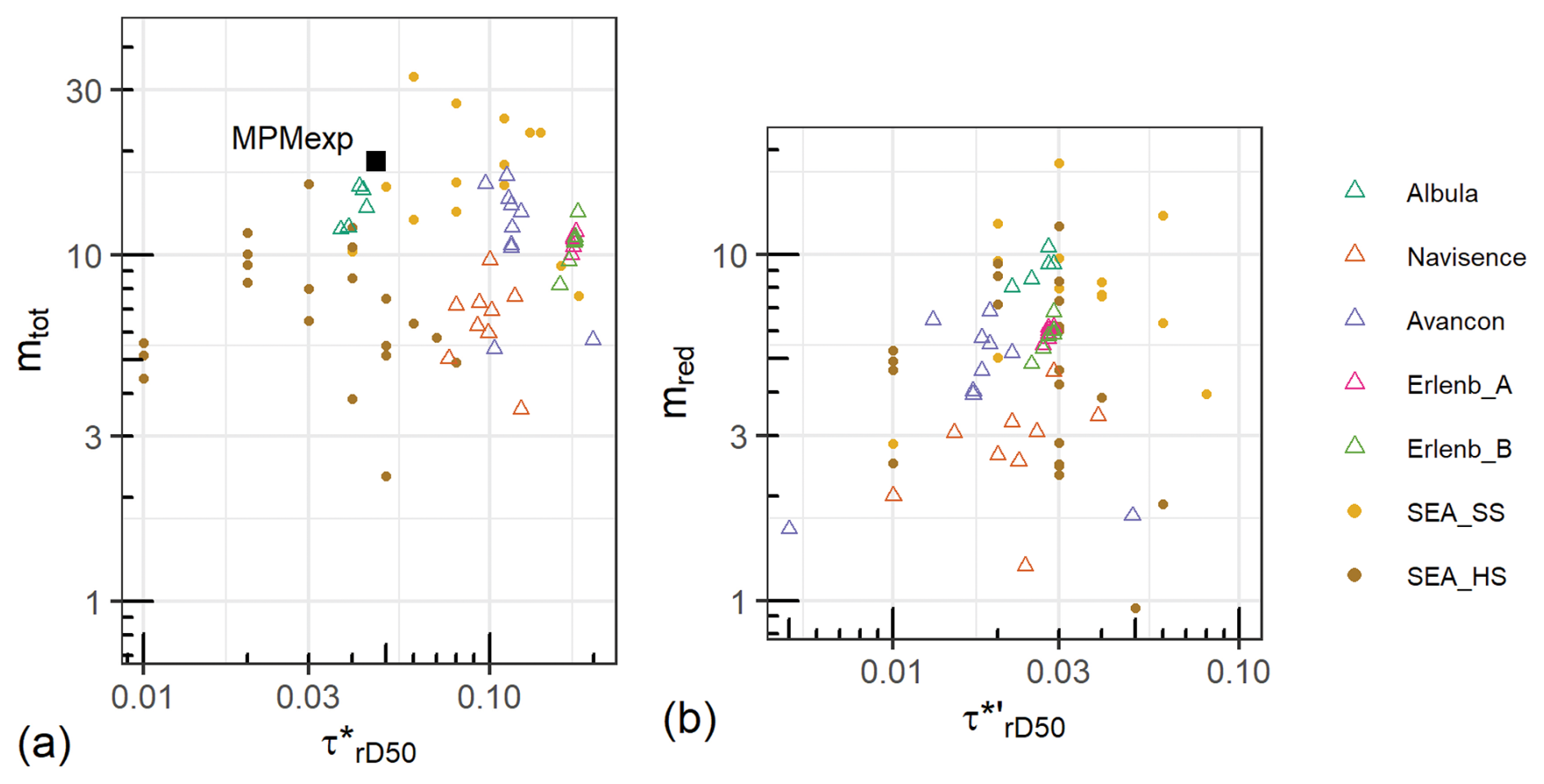 Turning to the analysis, the mean mred values of the four Swiss streams fall again between those of the SEA_SS and SEA_HS data sets (Table 5). In general, the distribution of m and for the Swiss streams is more similar to that for the SEA_HS data, whereas the SEA_SS data plot somewhat separately (Fig. 5b). The mean values for each of the four Swiss streams and for the SEA_SS and SEA_HS data sets range from 0.02 (Avançon) to 0.036 (SEA_SS) (Table 5). This is a typical range for Shield stresses or for values for bedload transport equations based on a reduced or effective shear stress, with again a similar variability for each of the three data sets.