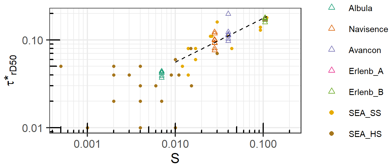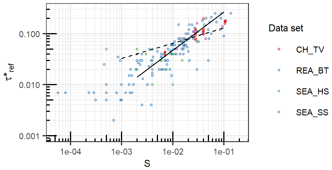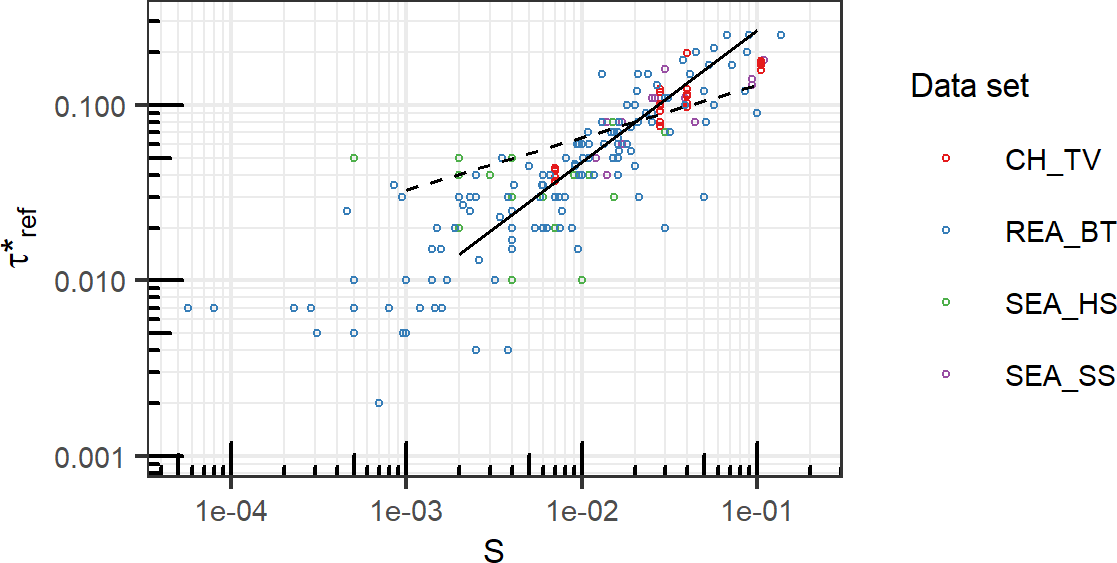 Figure 9Optimized values of vs. channel slope S, for various datasets. For the CH-TV, SEA_SS and SEA_HS data, was determined based on a analysis. For the REA_BT data, was derived from the Recking equation assuming a fixed exponent β = 4 (case 1 analysis). The solid black line is Eq. (33) derived from the REA_BT data with a plane-bed morphology. The dashed black line is Eq. (32) from Recking et al. (2016) based on flume experiments and used in their case-2 analysis.