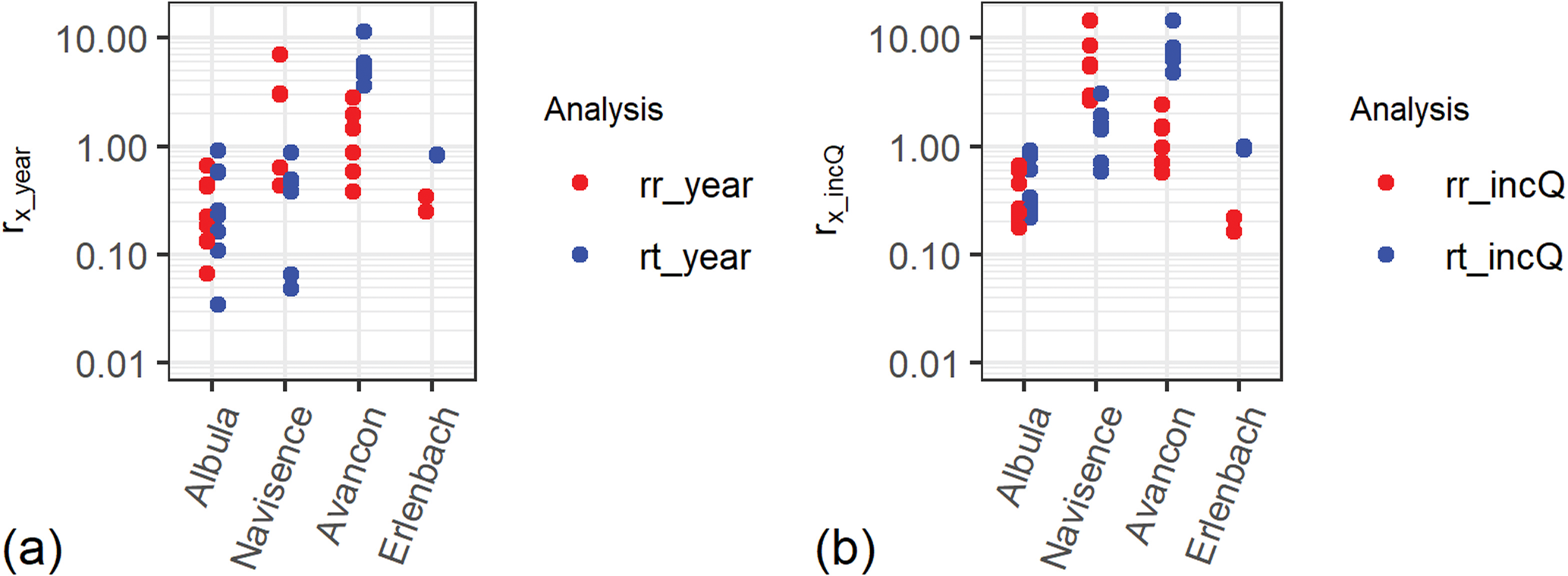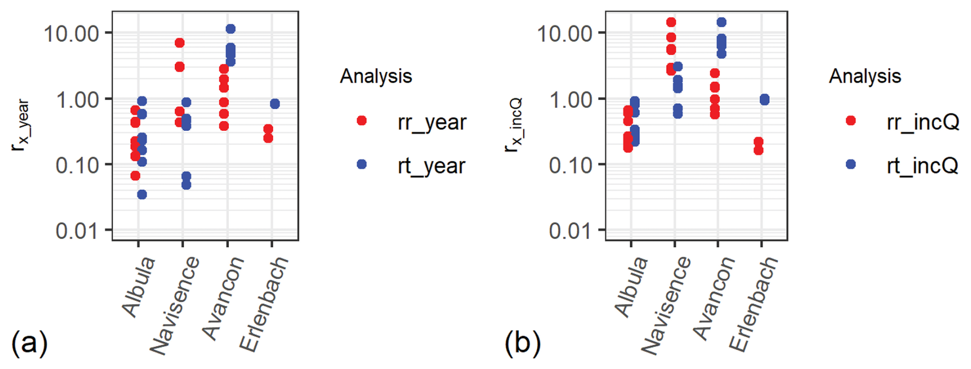 Figure 7Variability of (a) rx_year and (b) rx_incQ, separately for the analysis with the Qbtot calculations (x=t) and for the Qbred calculations (x=r).