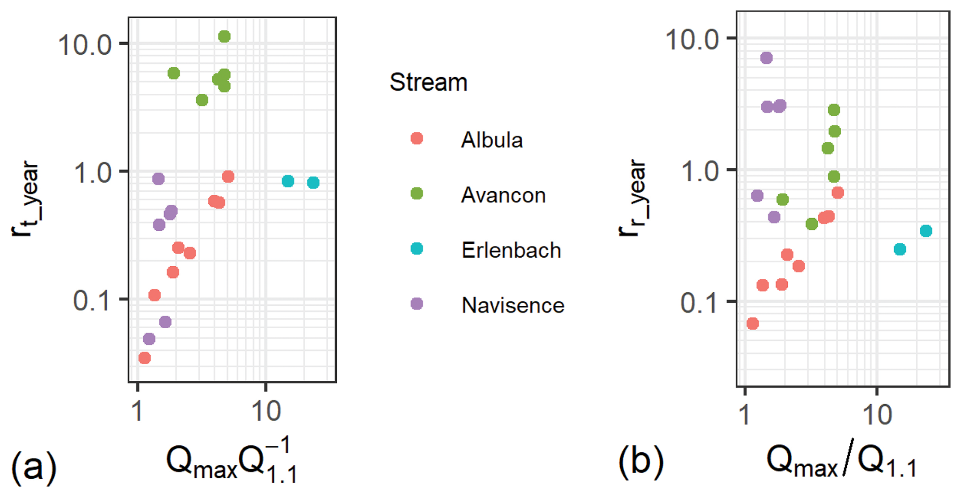 A similar picture becomes apparent when comparing the ratios rt_year and rr_year (Fig. 7a) and the ratios rt_incQ and rr_incQ (Fig. 7b) for the four streams, for both the analysis and for the analyses: While there is a tendency to under-estimate the observed bedload masses for two streams (Albula, Erlenbach), a tendency for an over-estimation is apparent for the other two streams (Navisence, Avançon). The variability of the ratios for a given stream and type of analysis ( or ) is similar for all cases. The effect of flow or transport intensity on the ratios rt_year (Fig. 8a) and rr_year (Fig. 8b) was considered by plotting these ratios against , where Qmax is the maximum water discharge for a given year and Q1.1 is the water discharge corresponding to a dimensionless shear stress = 1.1 (Table 3). For the Albula, the ratios indicate that the calculated and observed bedload masses are more closely aligned at higher flow intensities. For the other three streams, no clear trend appears. However, when accounting for all the stream sites, one may see a slight trend towards increased agreement between the calculated and observed bedload masses for increasing flow intensities This is somewhat clearer for the analysis than for the analysis.