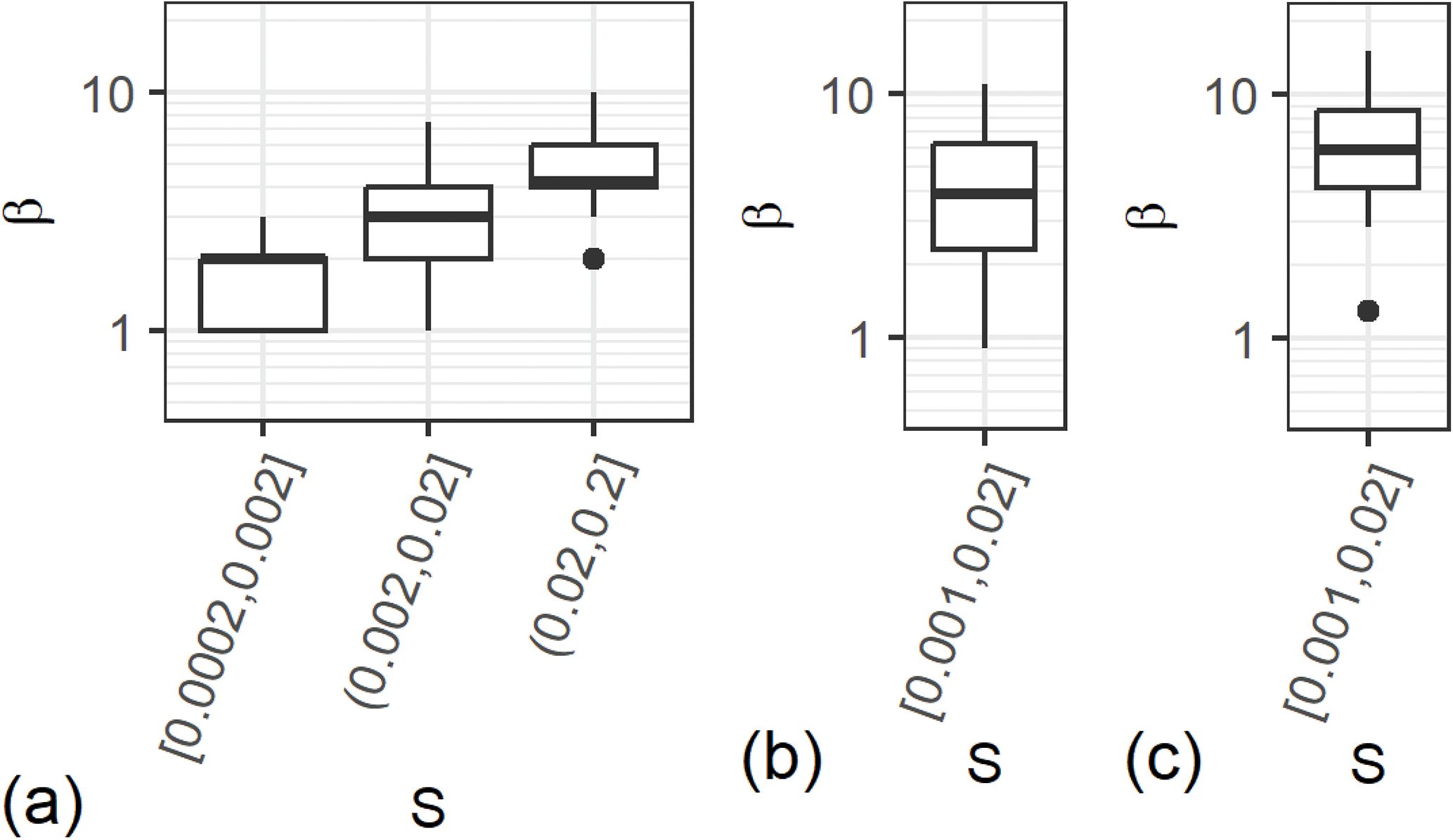 Figure 10Boxplots of the exponent β for different for channel slope classes. (a) for the entire REA_BT data, for the case 2 analysis assuming Eq. (23) to pre-define the values, (b) for the SEA_HS data, derived from the analysis, (c) for the SEA_HS data, derived from the t analysis. For the SEA_HS data from Schneider et al. (2015a), 19 out of 21 data points fall into the slope class shown here.