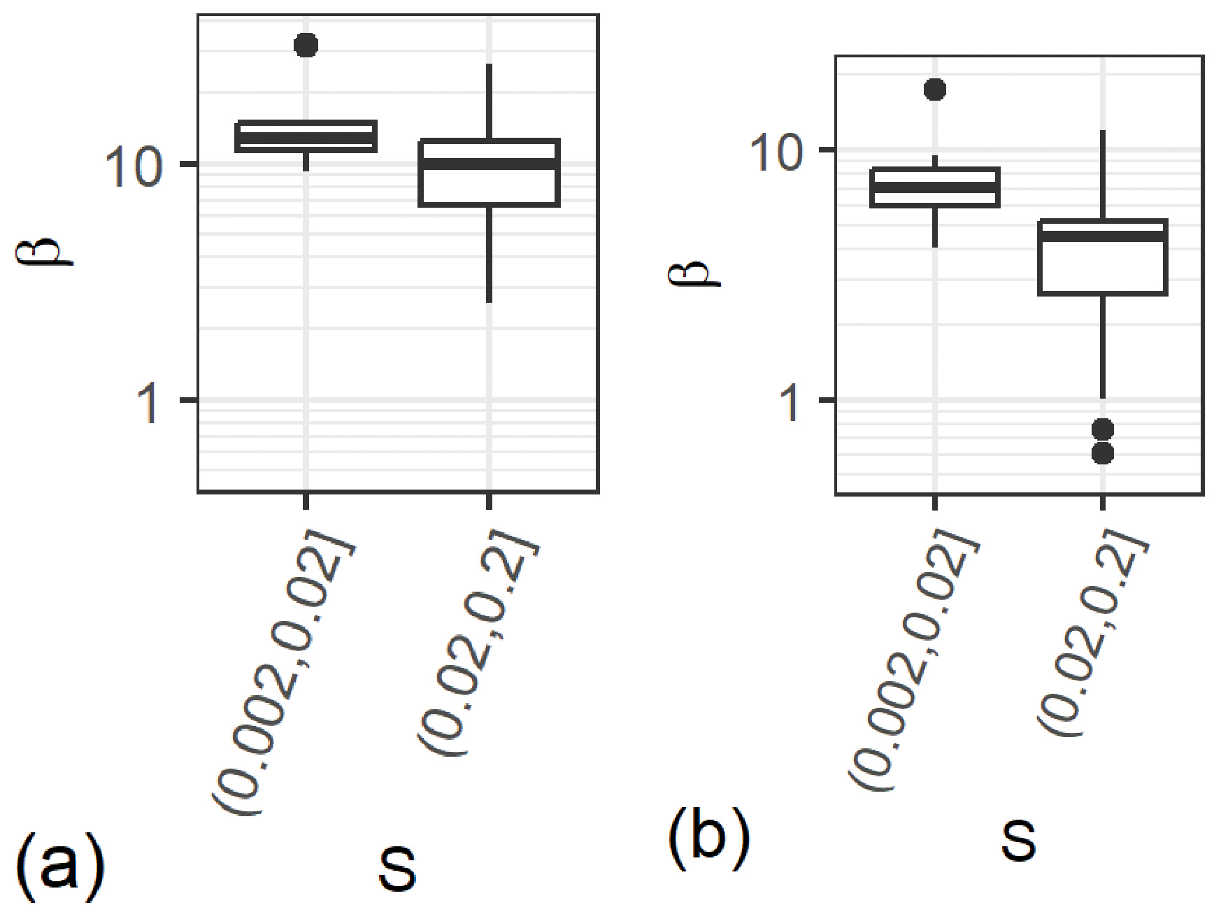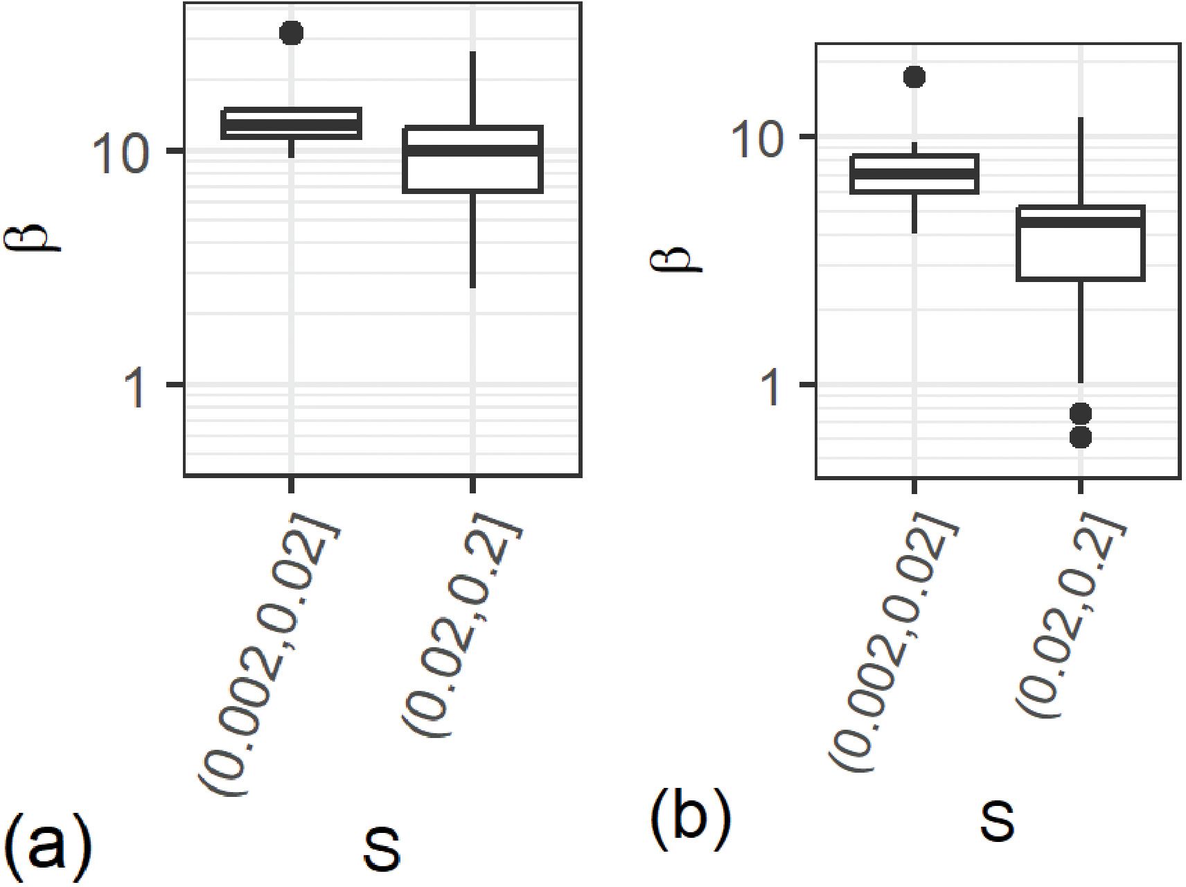 Figure 11Boxplots of β for the CH_TV and SEA_SS data combined, for 2 slope classes, derived (a) from the analysis, and (b) from the analysis.