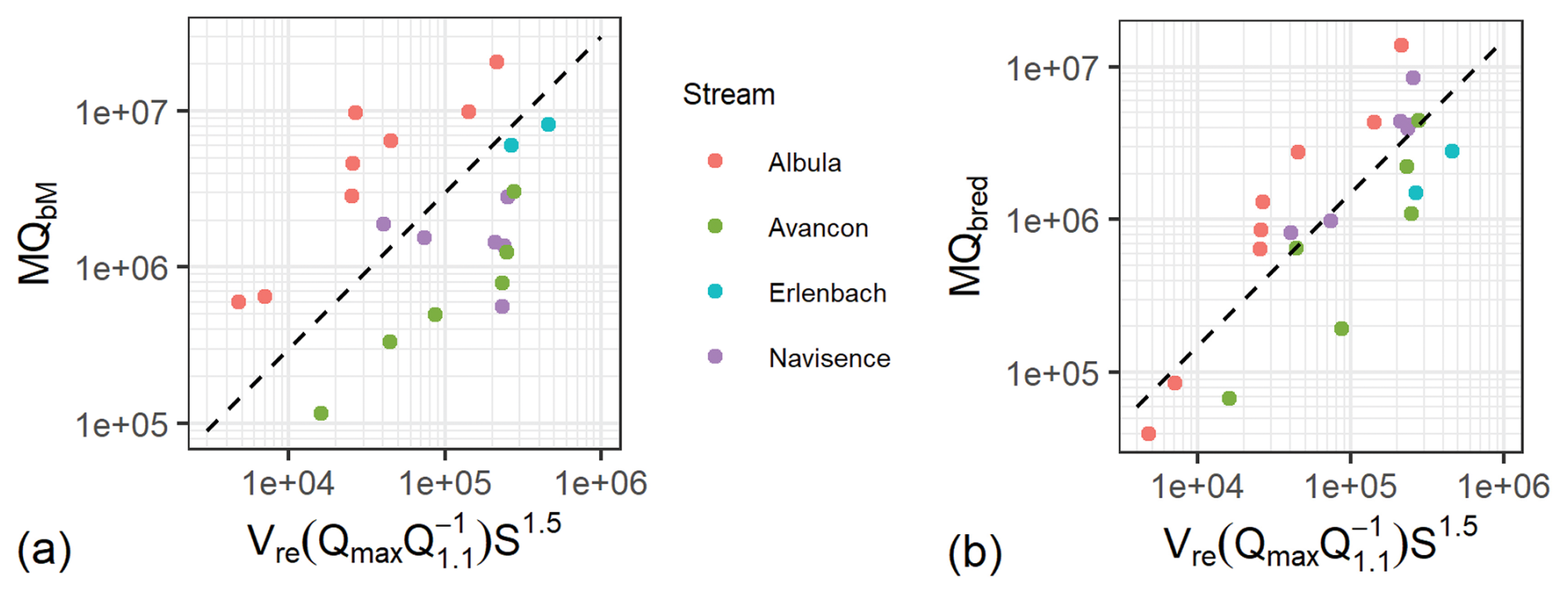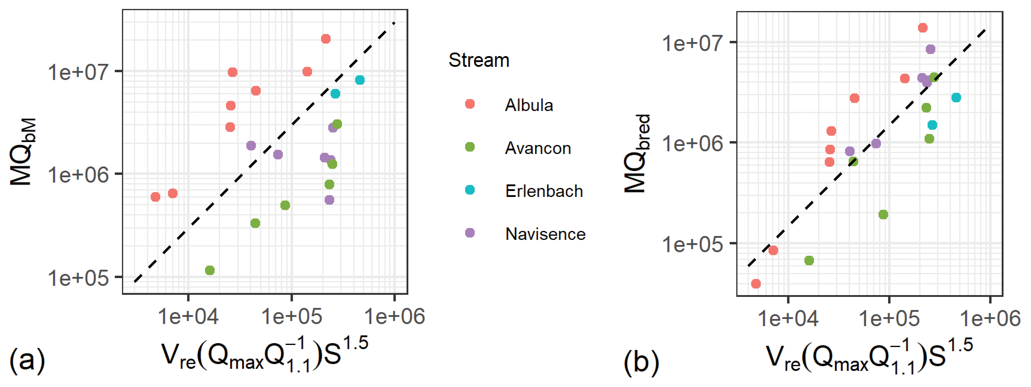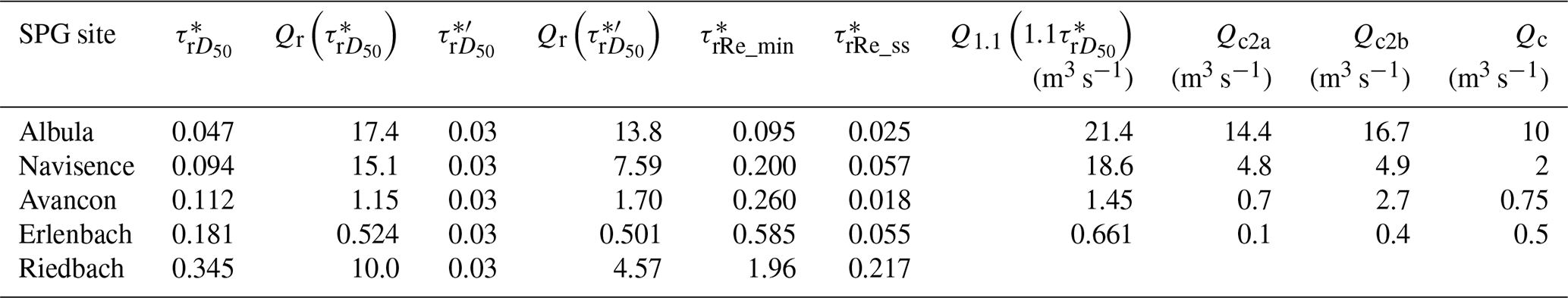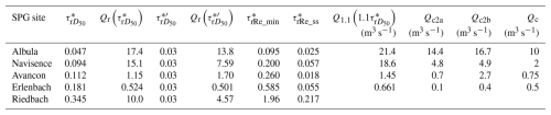 Table 3Dimensionless reference shear stresses () used for the calculations with the different bedload transport equations. For the application of QbMPMexp to the Albula, = 0.0467, as compared to the application of Qbtot to the Albula with = 0.0469. Q1.1 is the water discharge corresponding to a dimensionless shear stress = 1.1 . Qc2a and Qc2b is the critical discharge for begin of phase-2 transport conditions according to empirical equations of Bathurst (2007). Qc is the critical discharge for begin of substantial bedload transport, as used in Sect. 4.4 below for a simple measure of yearly flow intensity.
